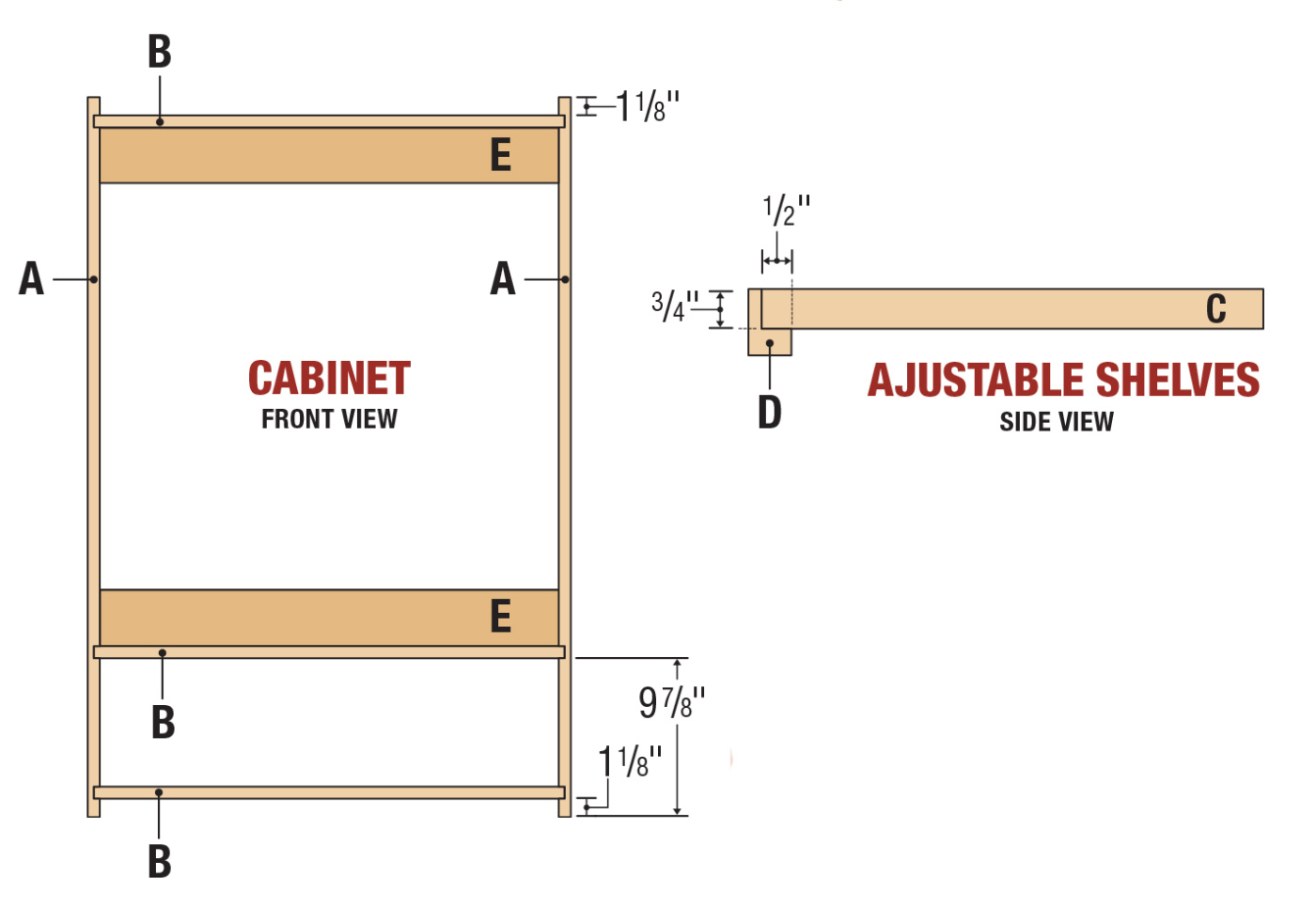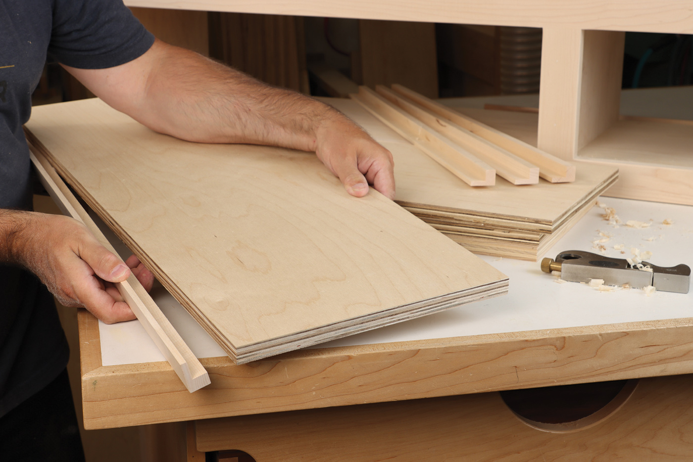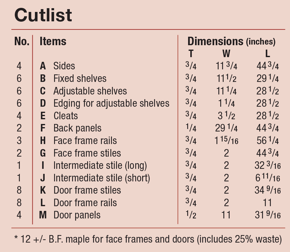 23 Trim out the adjustable shelves with hardwood edging, and glue it in place. This nosing was made from 11/4″ wide maple and rabbeted to fit the 3/4″ plywood.