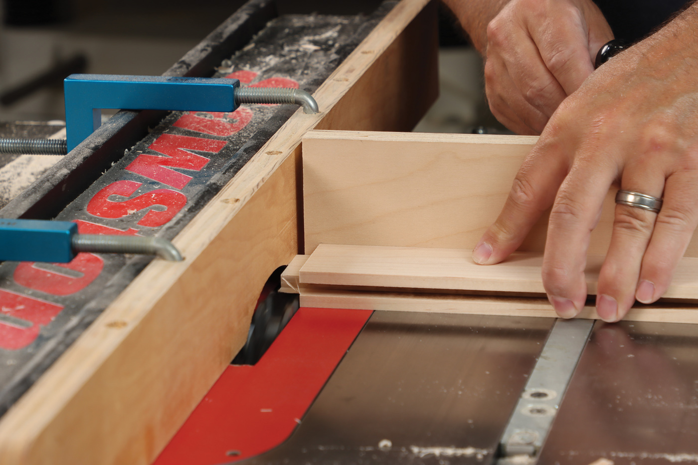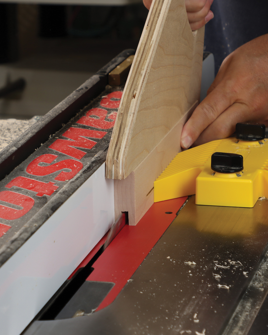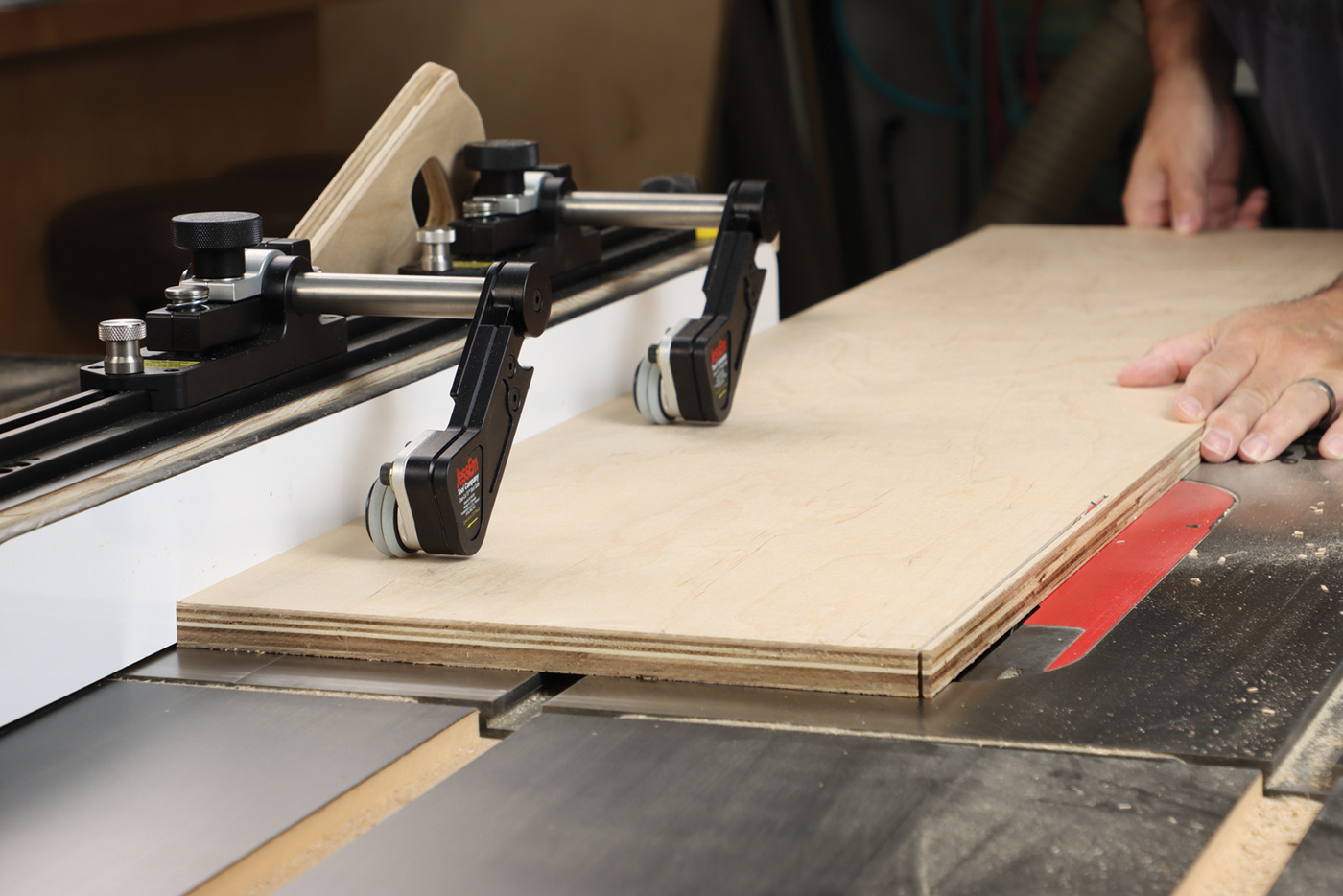 1 Rip parts to size at the table saw with safety gear. My favorite option is Jessem’s Clear Cut Stock Guides which hold the workpiece down and against the fence simultaneously. They’re great for ripping full sheets of plywood where a featherboard won’t work.