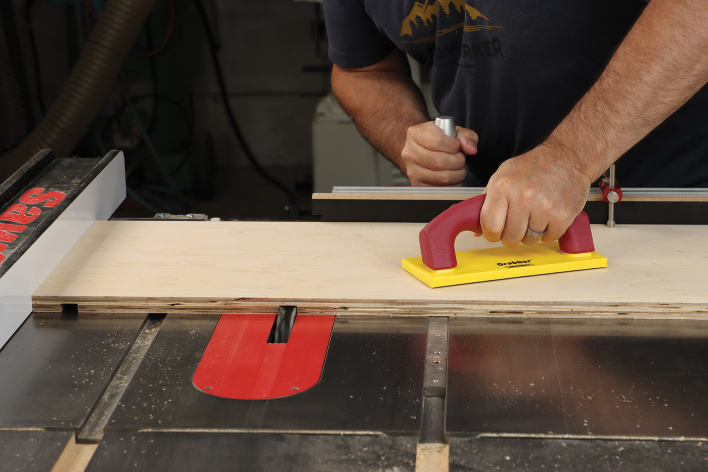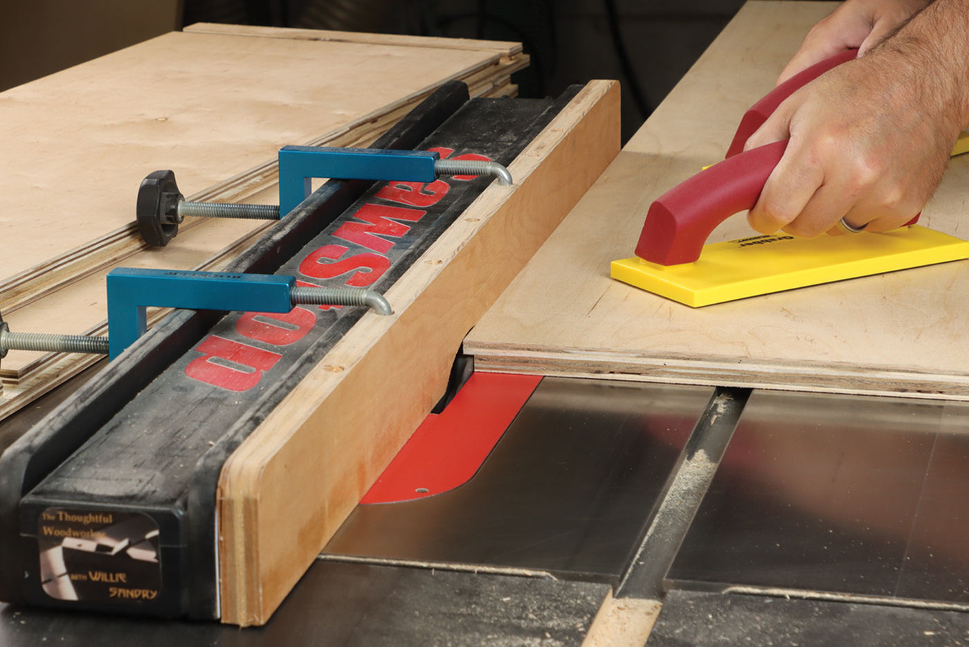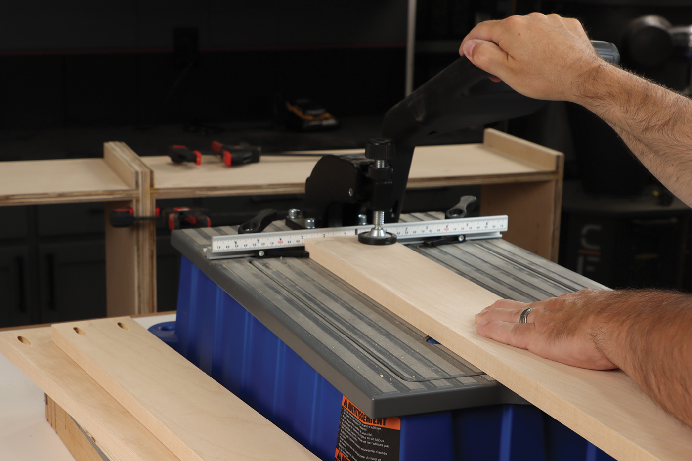 1 Rip parts to size at the table saw with safety gear. My favorite option is Jessem’s Clear Cut Stock Guides which hold the workpiece down and against the fence simultaneously. They’re great for ripping full sheets of plywood where a featherboard won’t work.