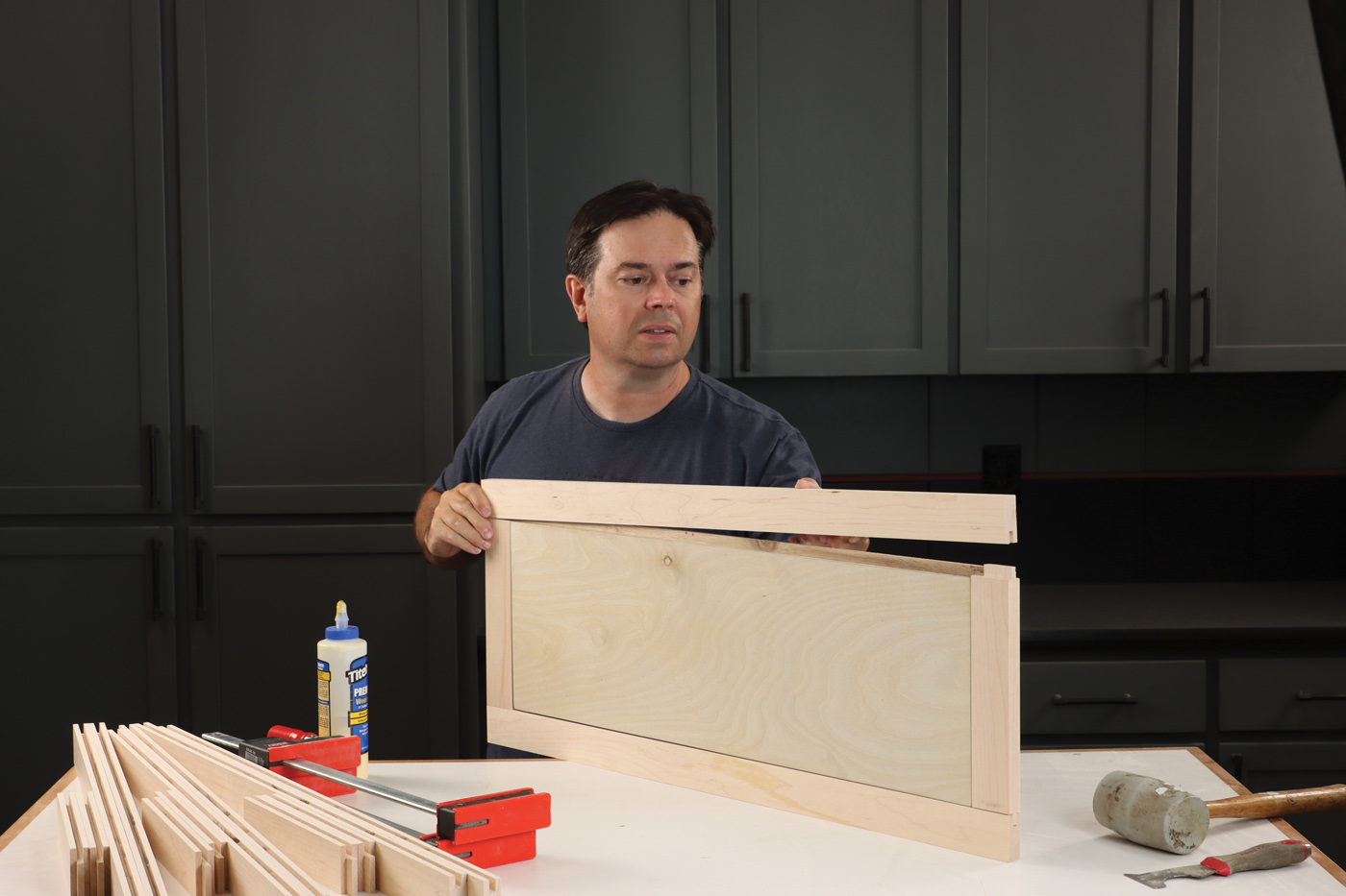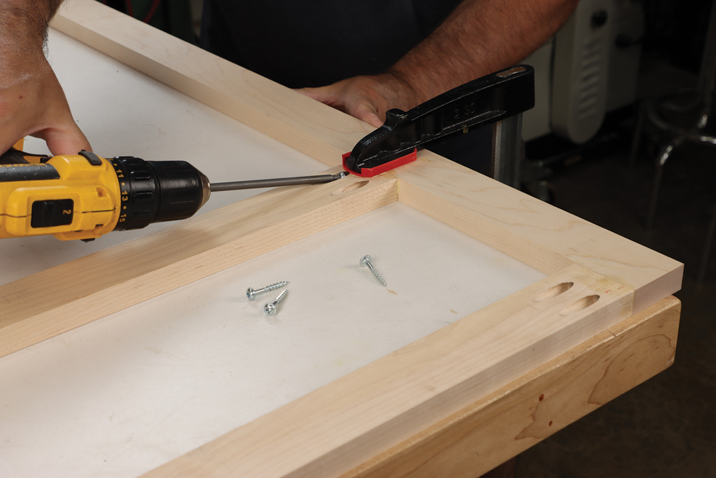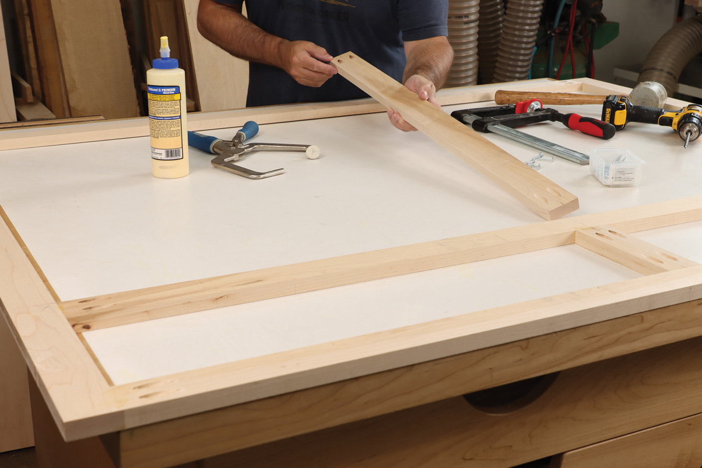 11 Assemble the face frame, sized to cover both cabinets. Clamping the parts down to your workbench is the key to flush joints.