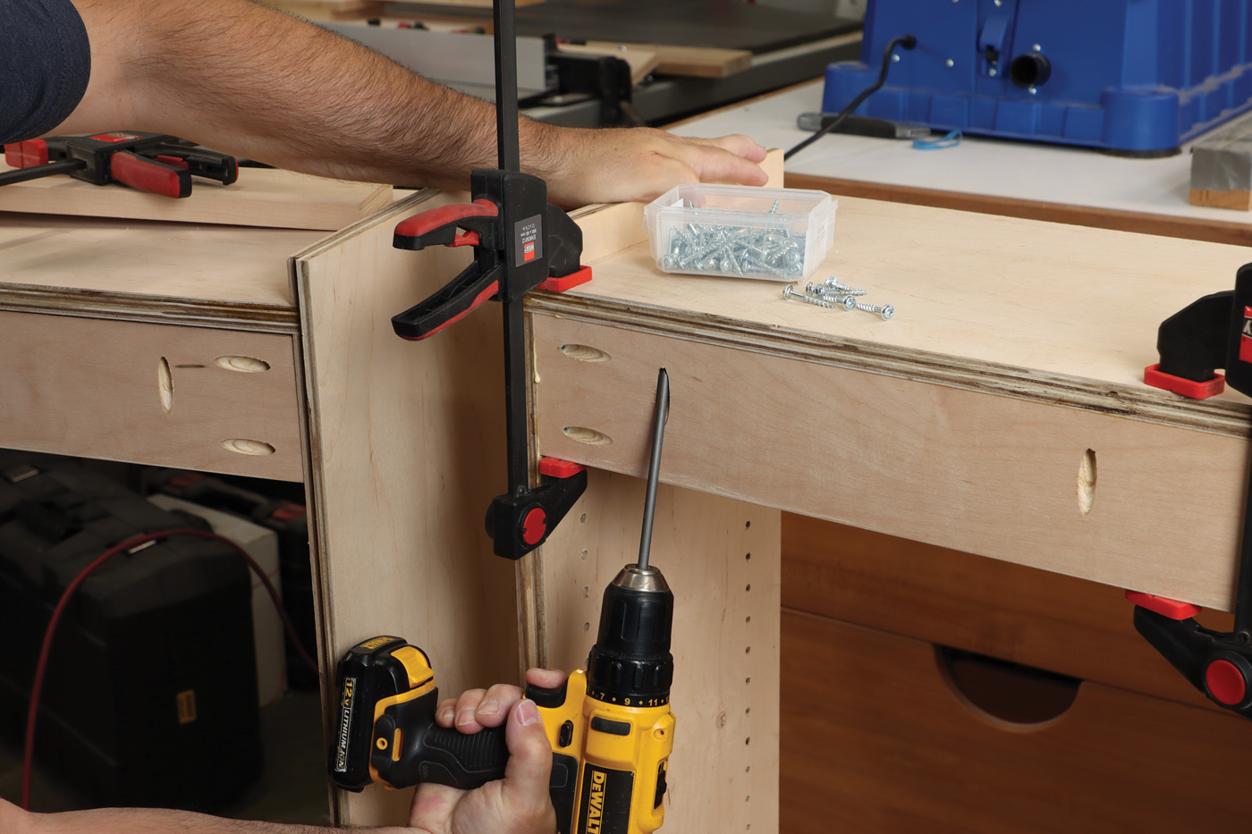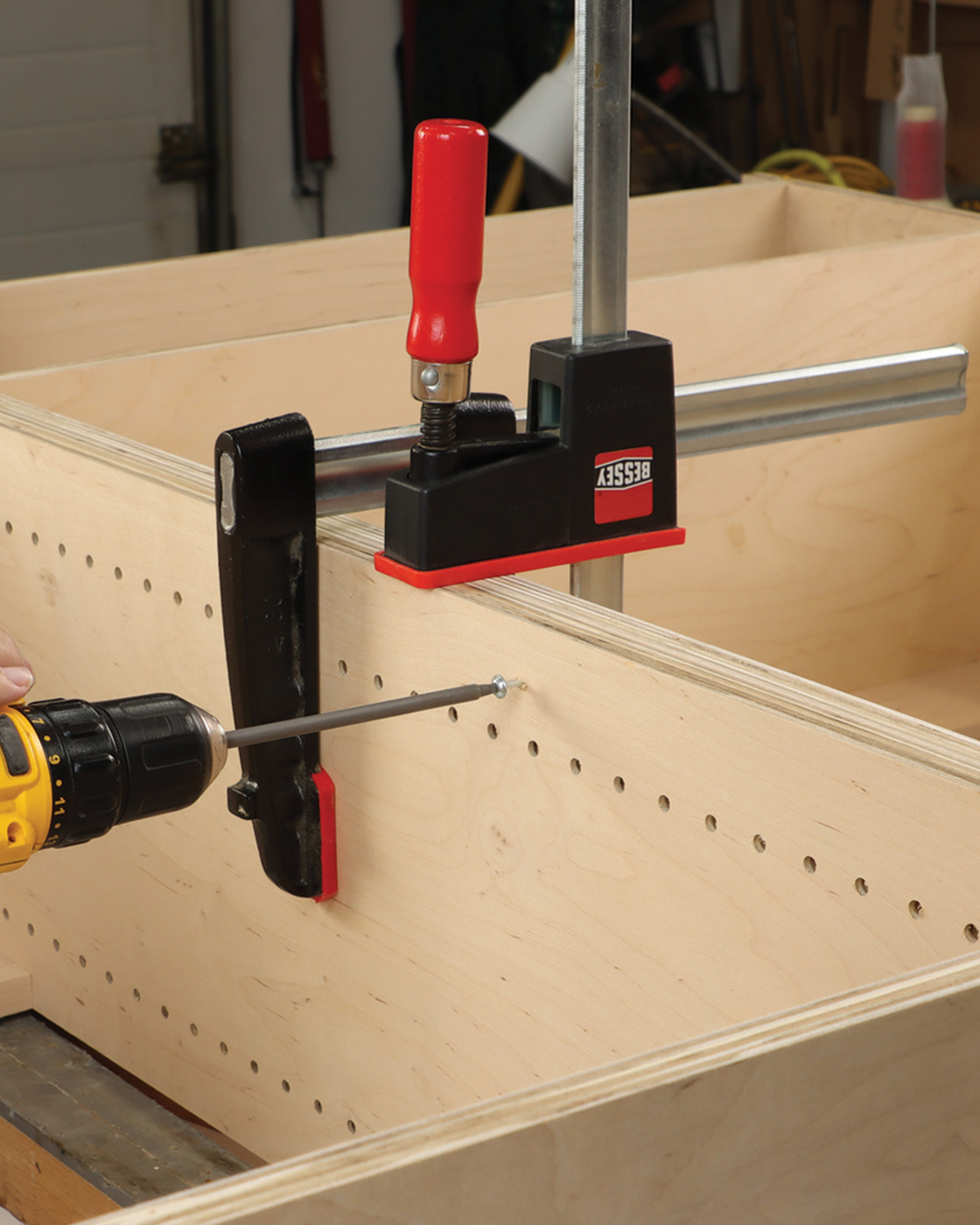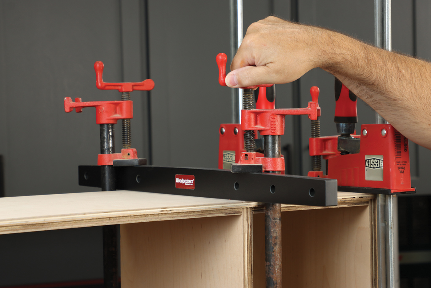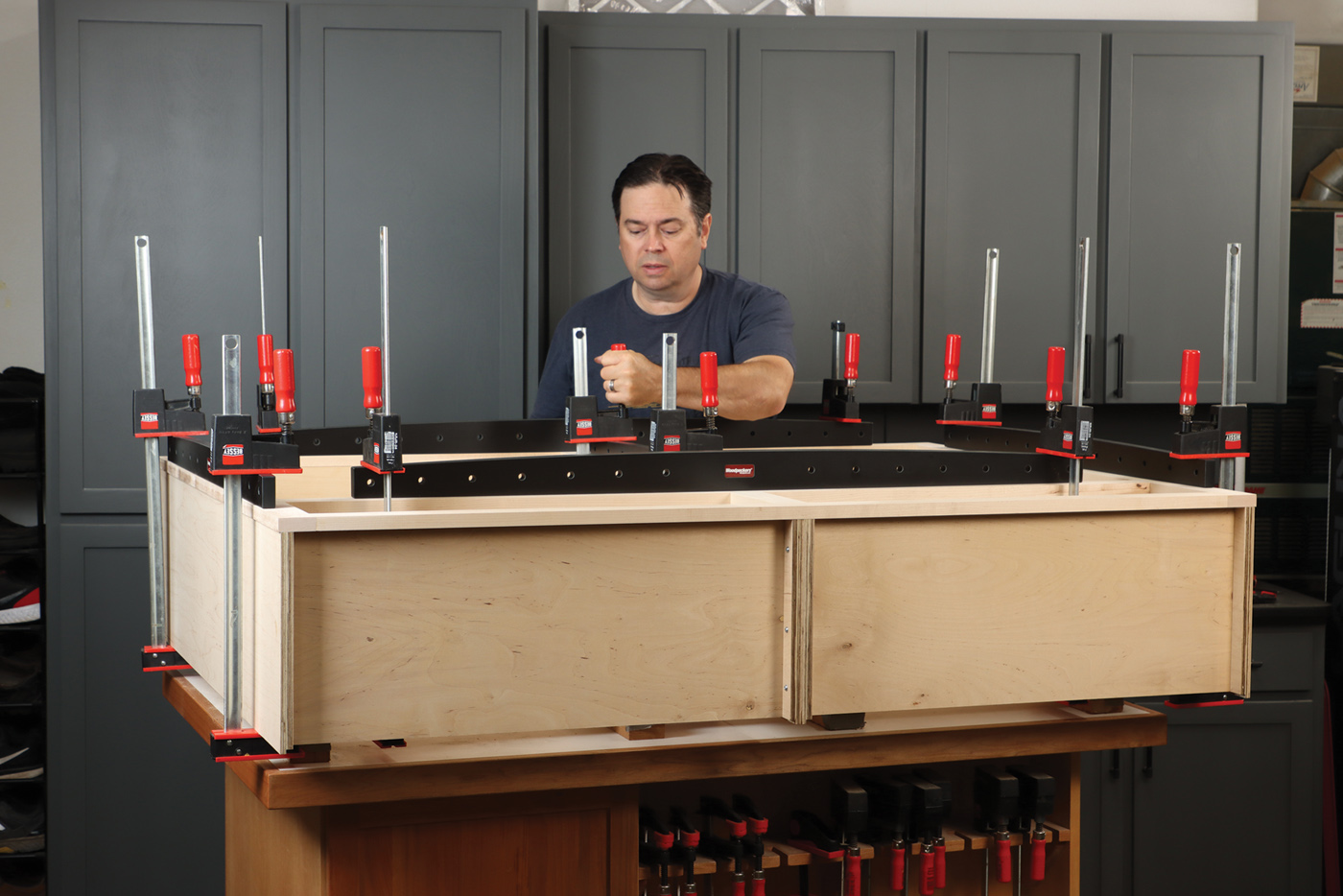 13 Secure the face frame to the cabinet assembly with cauls of various length, and a few clamps.
