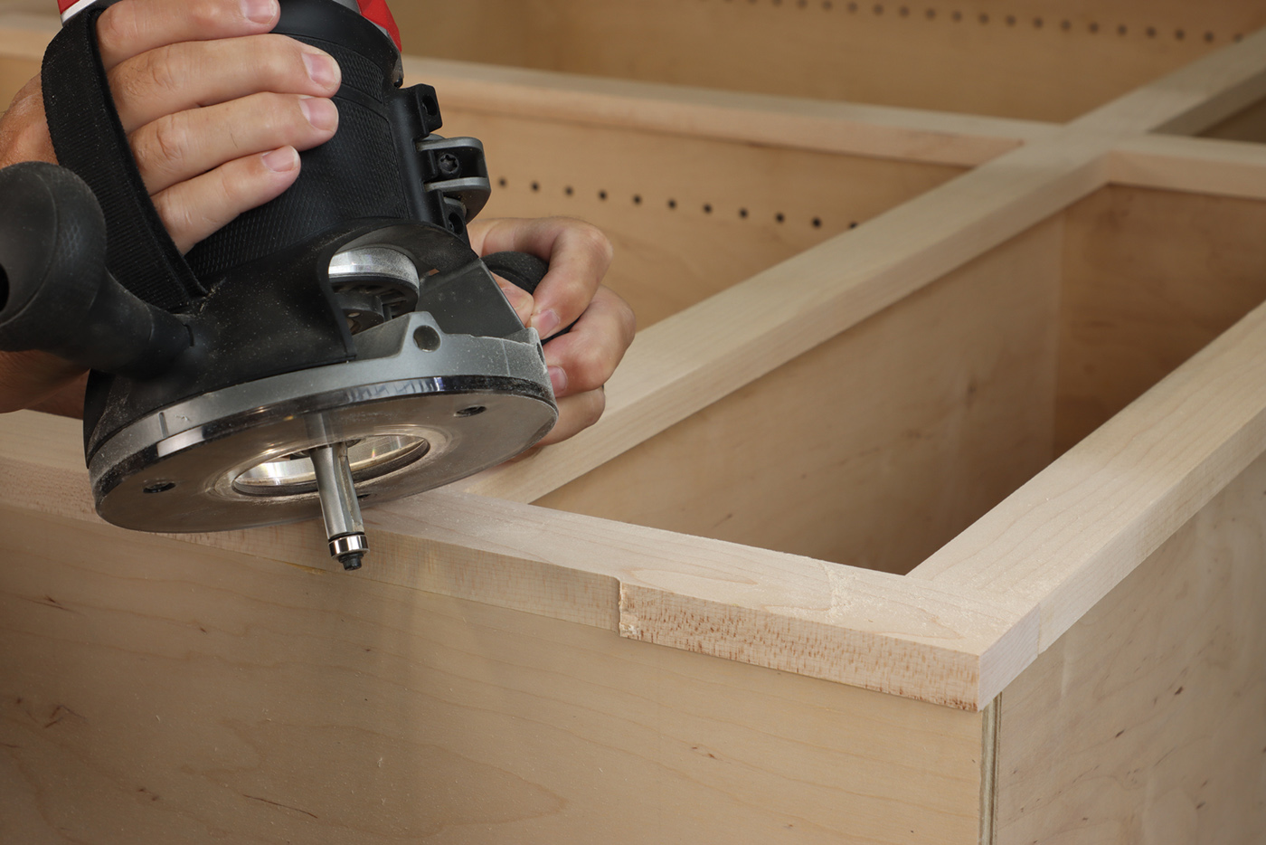 14 Trim the face frame where it overhangs the left and right side of the cabinet with a router and bearing-guided flush trimming bit.