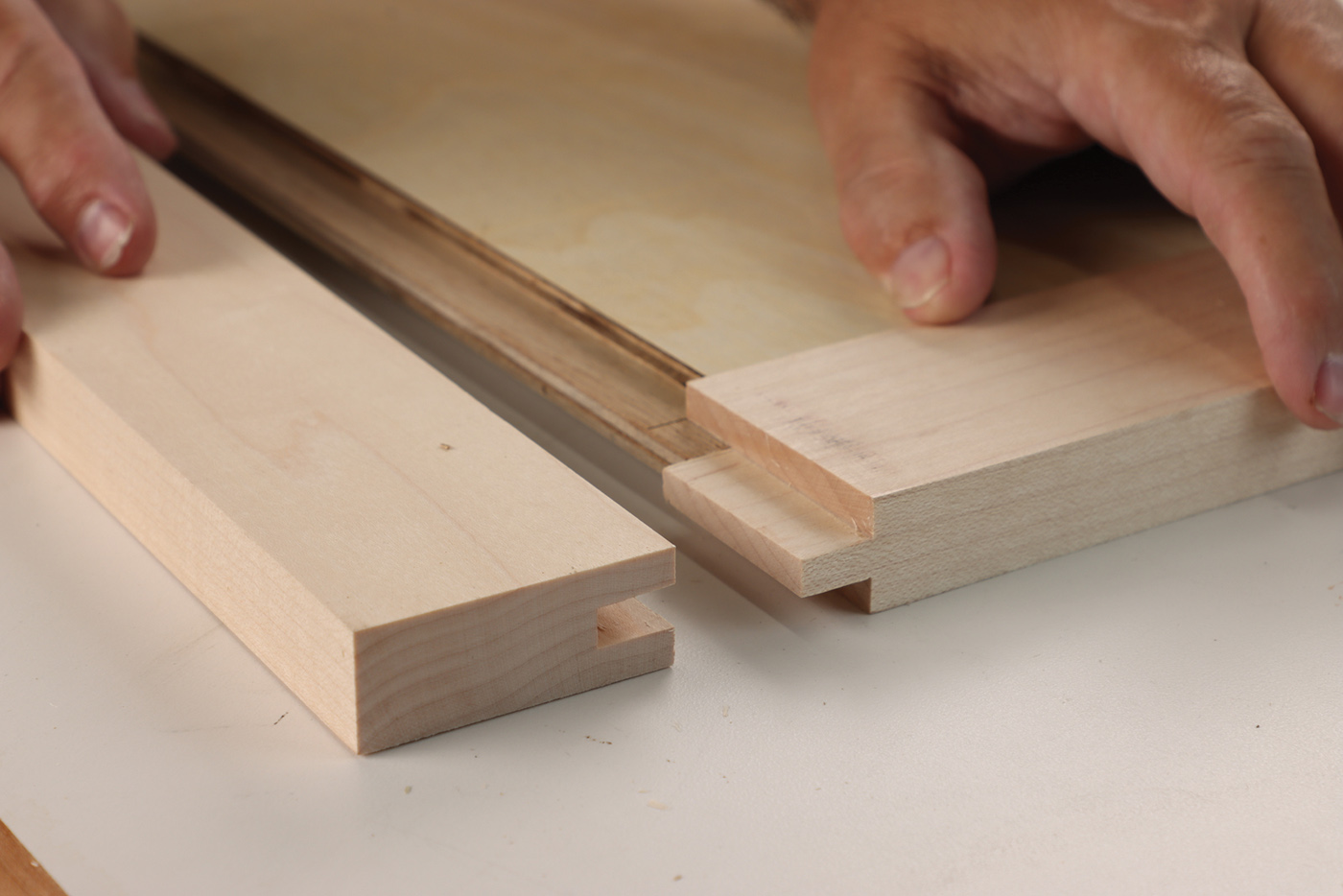 18 Once the stub tenon joinery fits well, rabbet the door panels to fit in the groove, and test fit the entire door.
