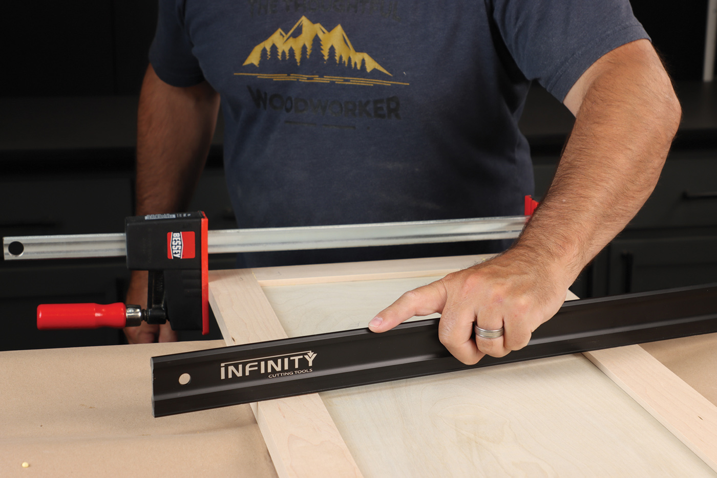 20 Once clamping pressure has been applied to the door, check that the parts remain flat with a quality straightedge. Adjust the clamps as needed to correct any twisting, before the glue sets.
