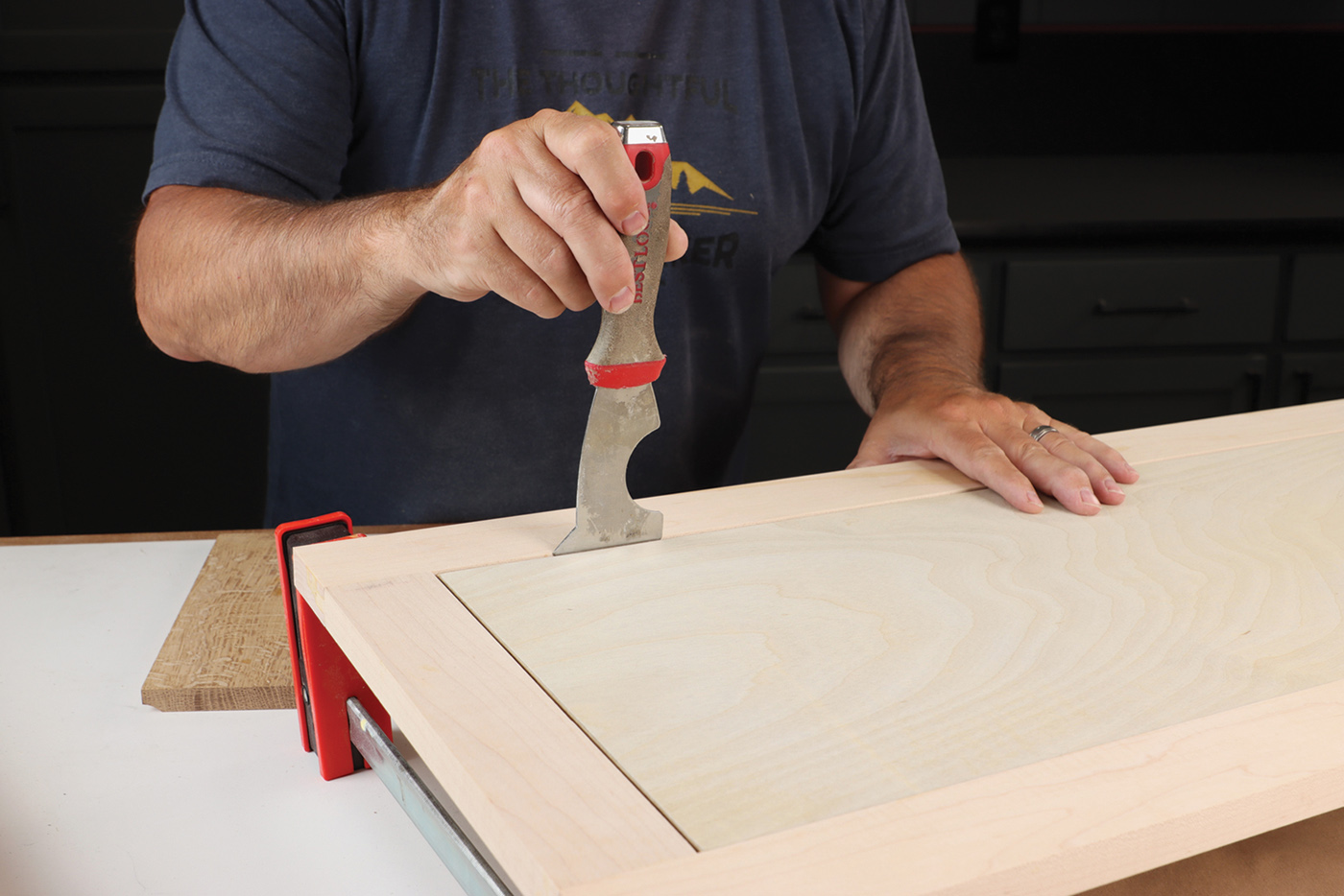 21 Flip the door over and center the 1/2″ plywood panel in the frame. A simple putty knife is the right tool for the job.