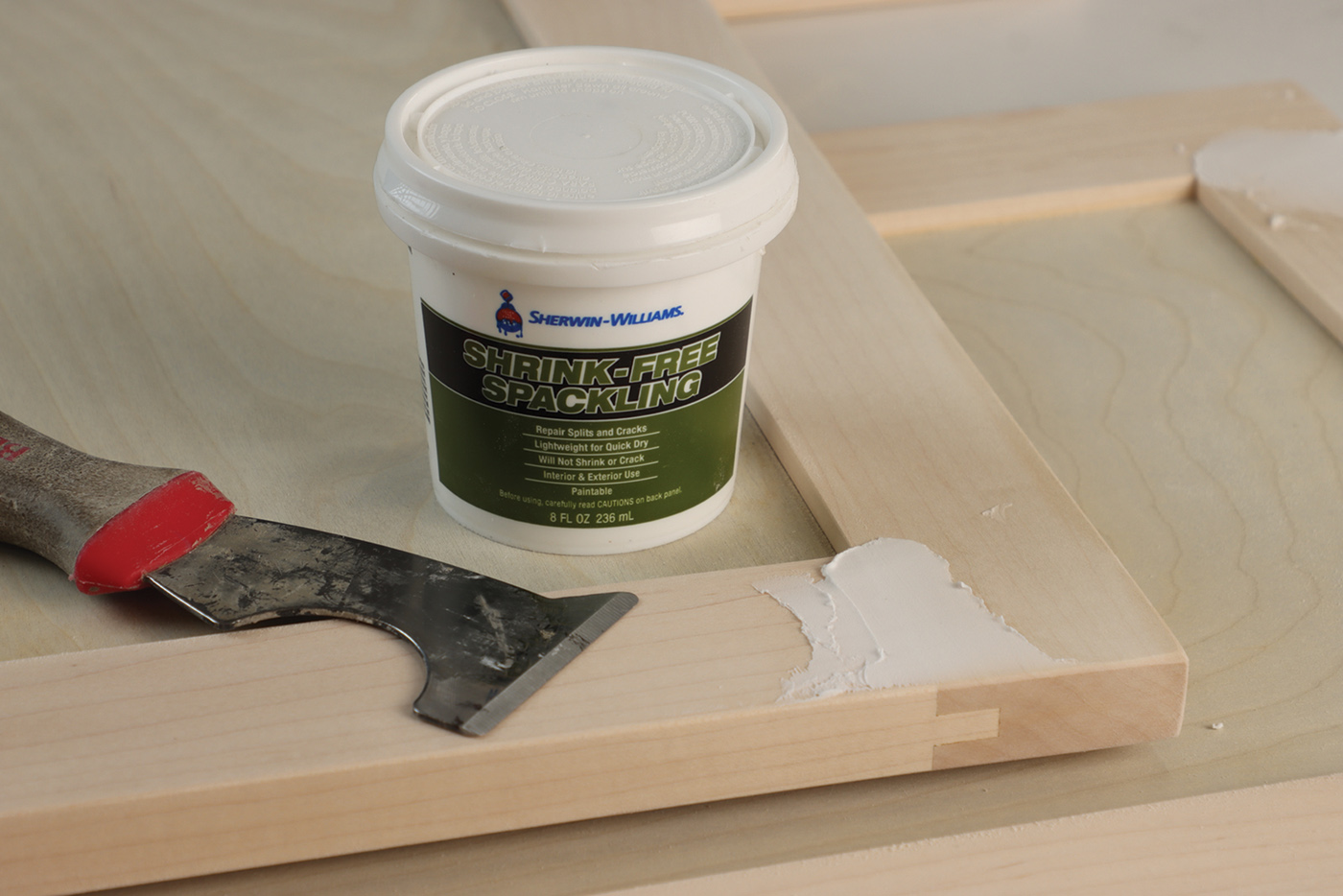 22 For paint grade cabinets, fill any nail holes or joint lines with a lightweight non-shrinking spackle. Leave the filler proud
