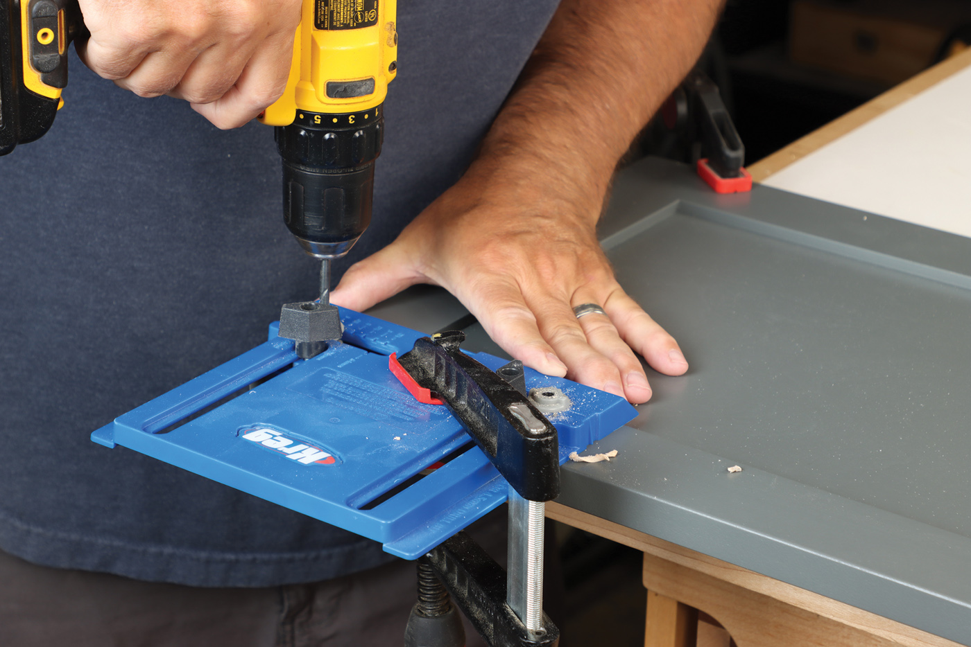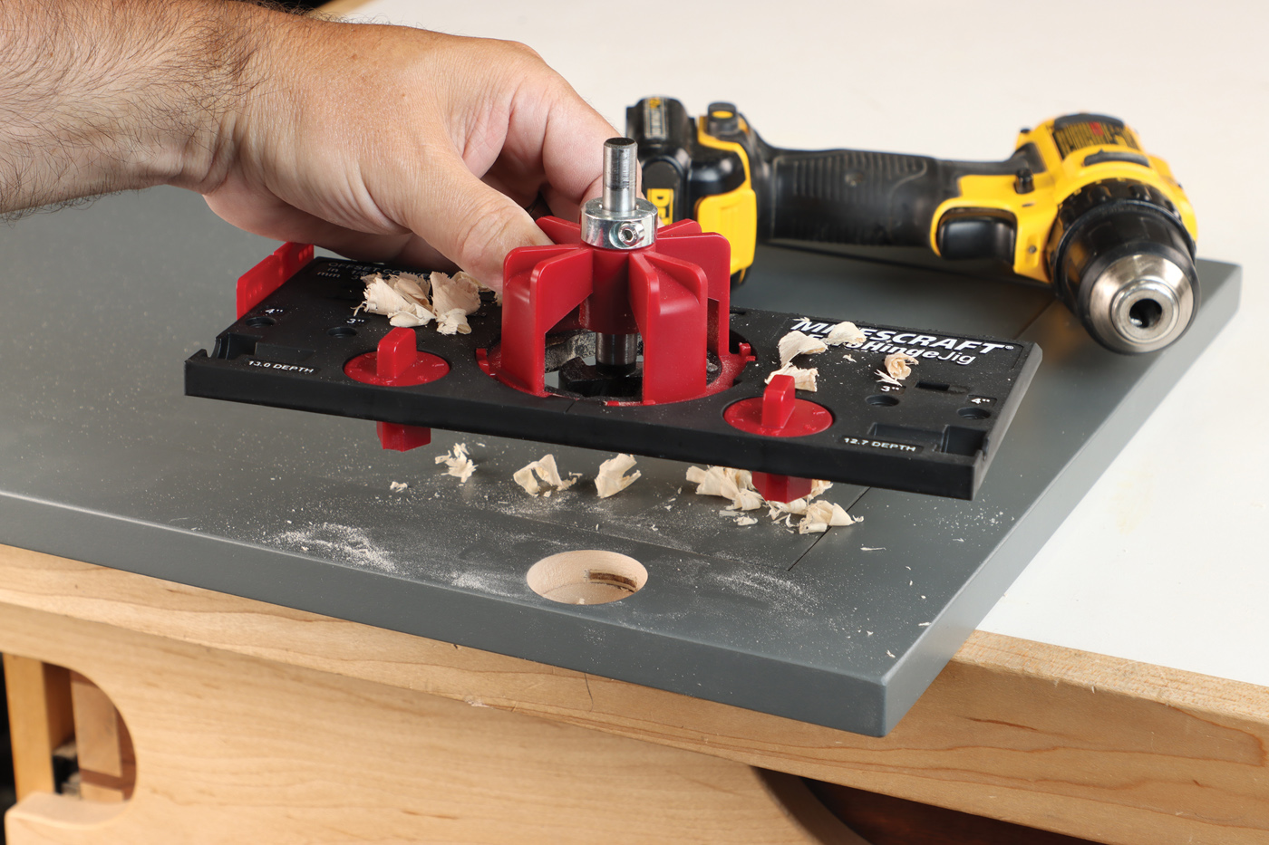 25 Drill 35mm holes with a dedicated hinge drilling jig, like this one from Milescraft. It helps to control both the offset and depth of the cut. A drill press also works for this step.