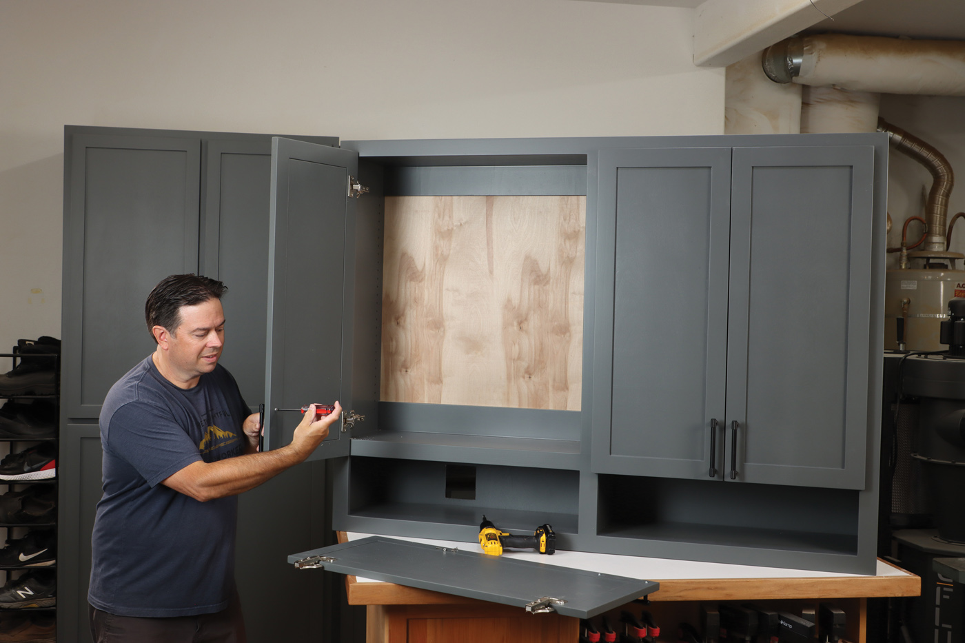 You’ll likely need to add an electrical outlet that surfaces in one of the cubbies. I had an outlet close but needed to relocate it higher to match the height of the cabinet. It’s pretty easy to do, but check your local electrical codes, and hire an electrician if you’re not comfortable with the work. A 1/4“ box extender is typically required to bring the outlets flush with the inside of the cabinet. This way, you’ll have a convenient way to charge and store all your batteries, while still allowing good air circulation for the charging equipment. Cut a hole for the receptacle and install the back panels with brad nails. Screw a temporary ledger board to the wall, and set the cabinet on it, as you attach it to the wall with twelve 21/2“ screws. When installing upper cabinets, I predetermine the stud locations and start the screws inside the cabinet. That way, you only need helpers for a moment when it’s time to hang the cabinet. Make sure to drive the screws through the upper and lower cleats for adequate strength.
