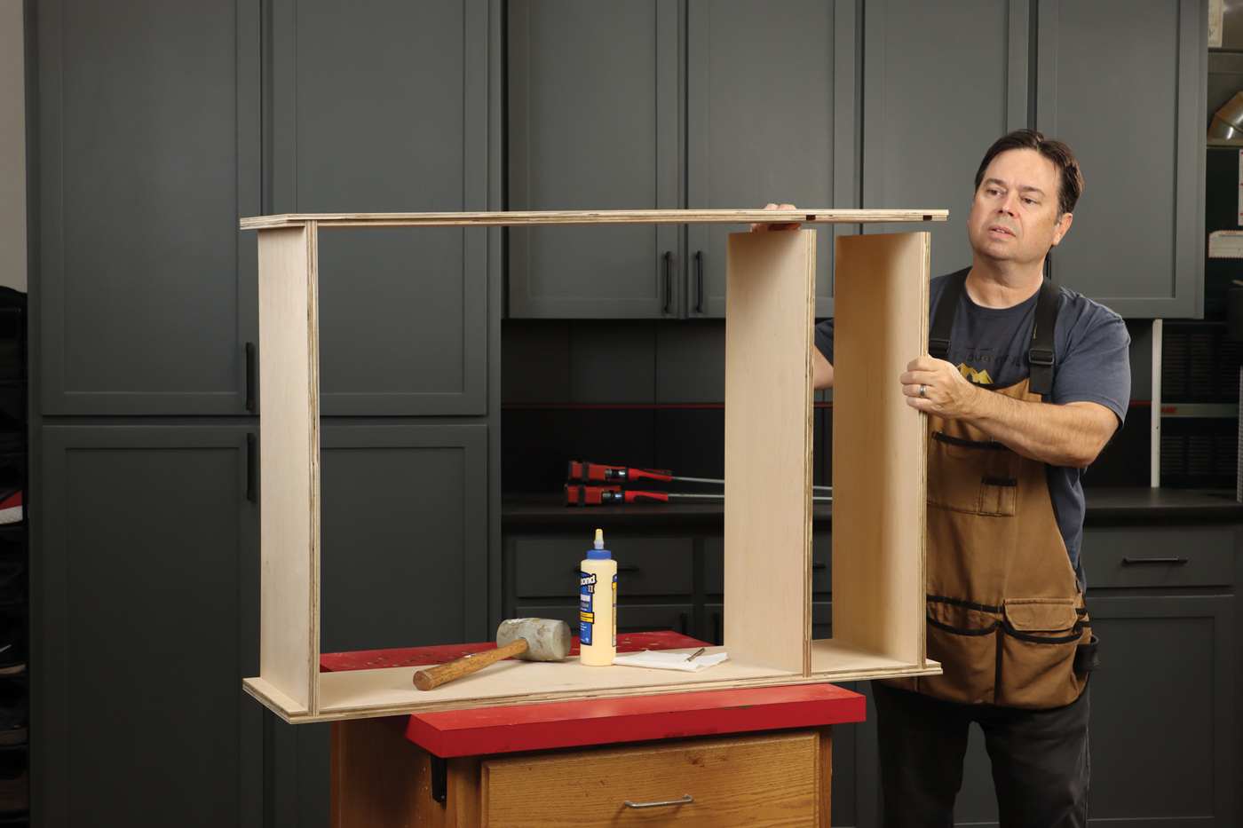 4 Test fit the parts and glue the cabinets together. Be sure to check for square as you tighten the clamps.