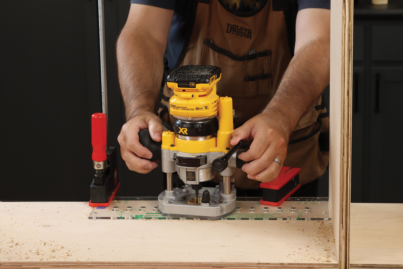 6 Drill the shelf pin holes on the assembled cabinet with a compact plunge router and acrylic template. A 1/4″ spiral upcut bit works best to prevent burning. Once you try this method, you’ll never go back to a drill bit!
