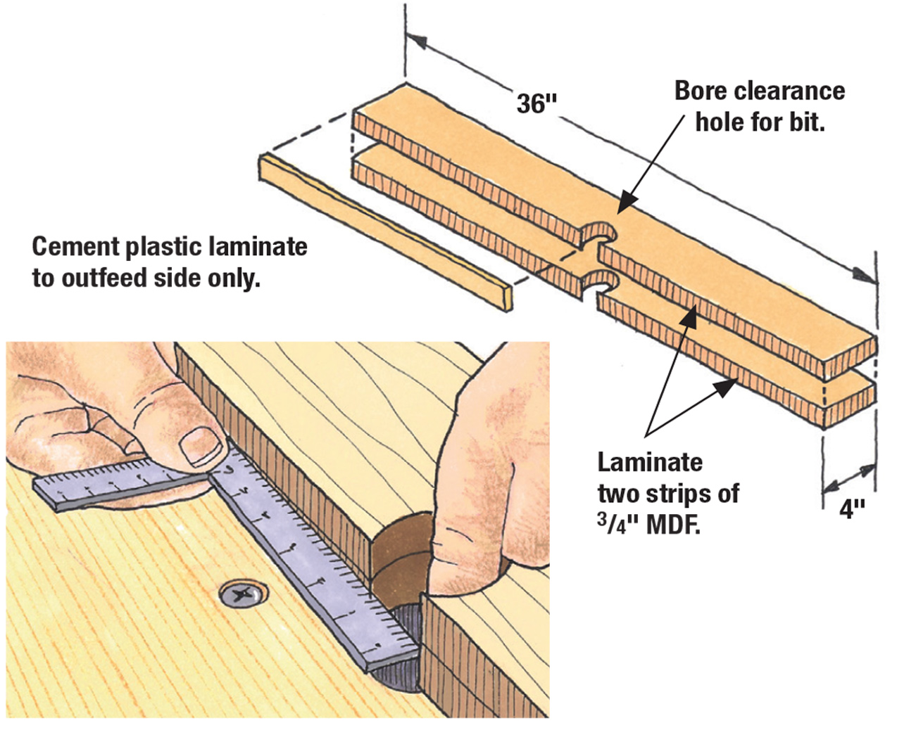 Make a perfect jointing fence by ripping two strips of MDF to 4″ wide. Glue them together and bore a clearance hole for the bit and you’re nearly there. The key to this fence is the application of laminate to the outfeed side of the fence.