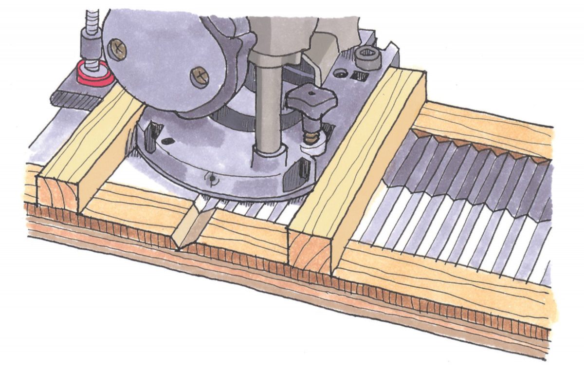 Your jig needs to be wide enough to span your workpiece, and you’ll need a 120° bit or an angle of your choosing. Slide the sled over to your next mark with each pass.