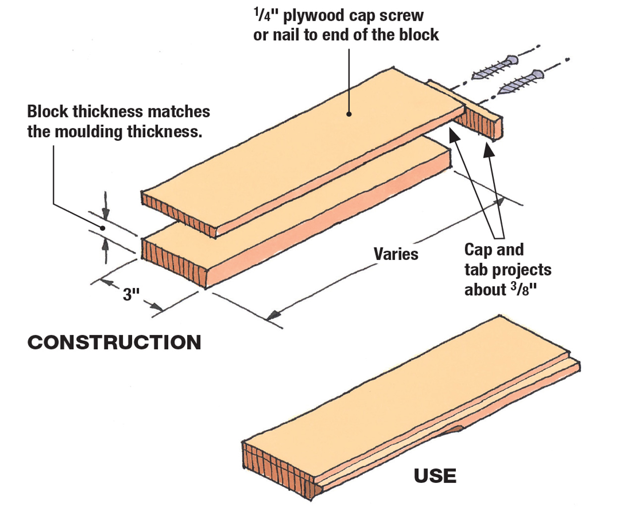 The length of this push block doesn’t matter as much as the width. Keeping your fingers 3″ from the bit is always a great idea. When pushing moulding through a shaping bit that’s less than an inch wide, use this pusher. The 1/4” plywood cap and back tab are the essential parts of this pusher.