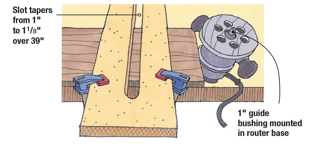 With a single piece of MDF or Baltic birch, you can create a jig that’ll guarantee a perfect sliding dovetail. It starts with two holes that determine the taper of the slot. At one end of your jig, drill a 1″ hole and on the other end of the jig, drill a 1-1/8” hole. Place a straight edge between the tangents of each hole and use a flush trim bit to make a perfect line between them. Use a 1″ guide bushing with the jig, and you’ll be able to use any size dovetail bit.
