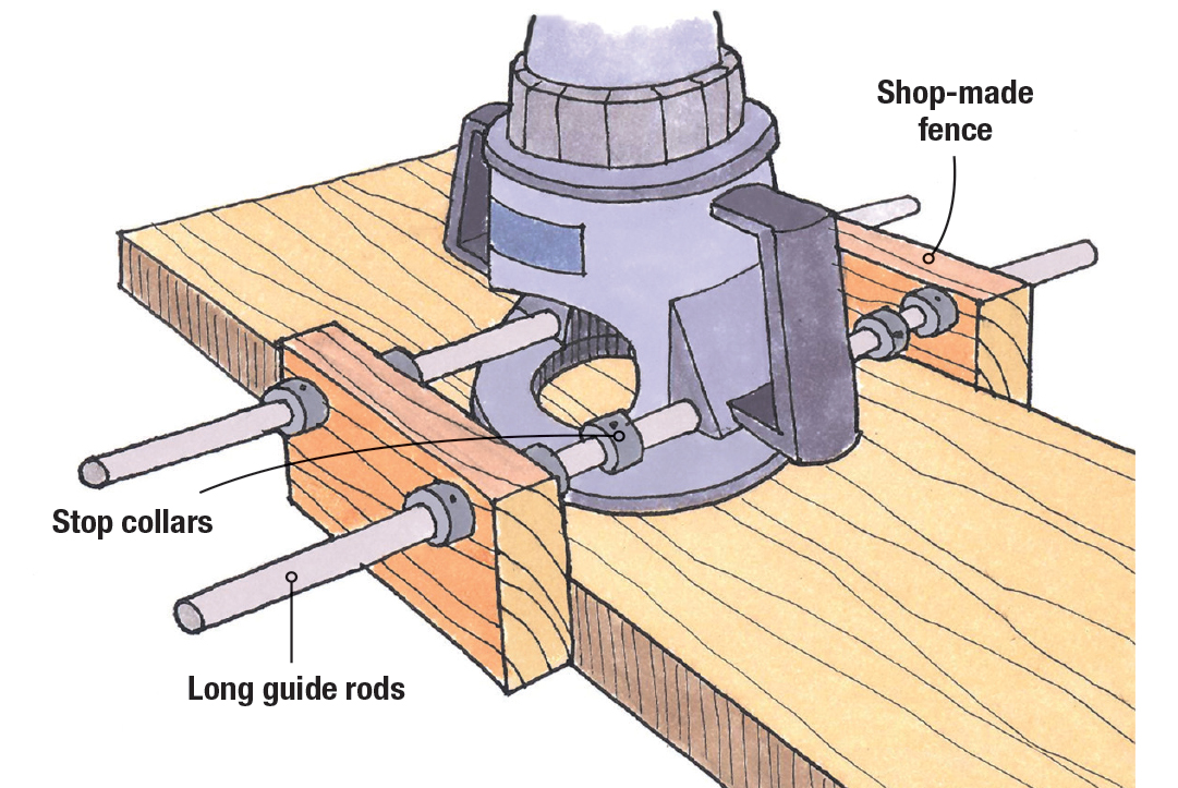 Huge mortises can be made with a clever adjustable fence. Use long guide rods that can span your workpiece and stop collars to control the travel. Most router bases accept these guide rods, so determine the spacing based on your router model. Accurate holes in the shop-made fence will prevent the assembly from racking as you slide it along the workpiece, and a bit of wax will keep things running smoothly.