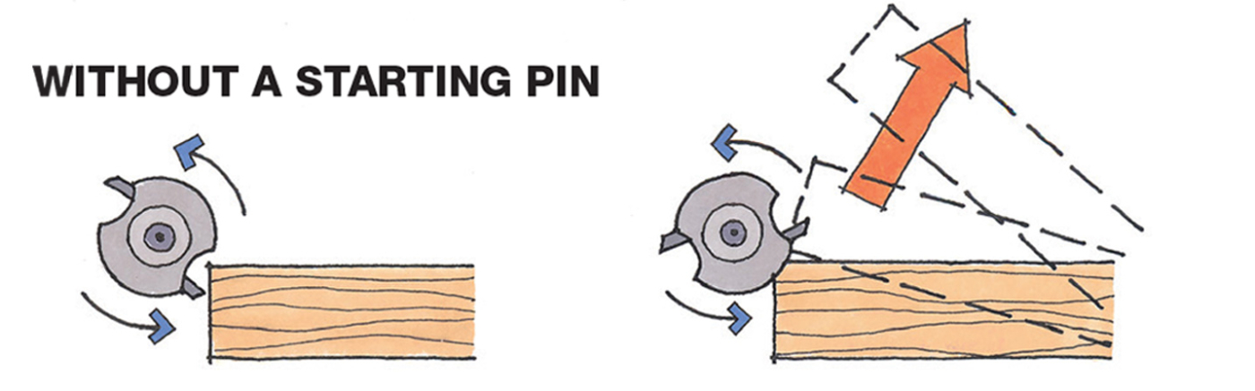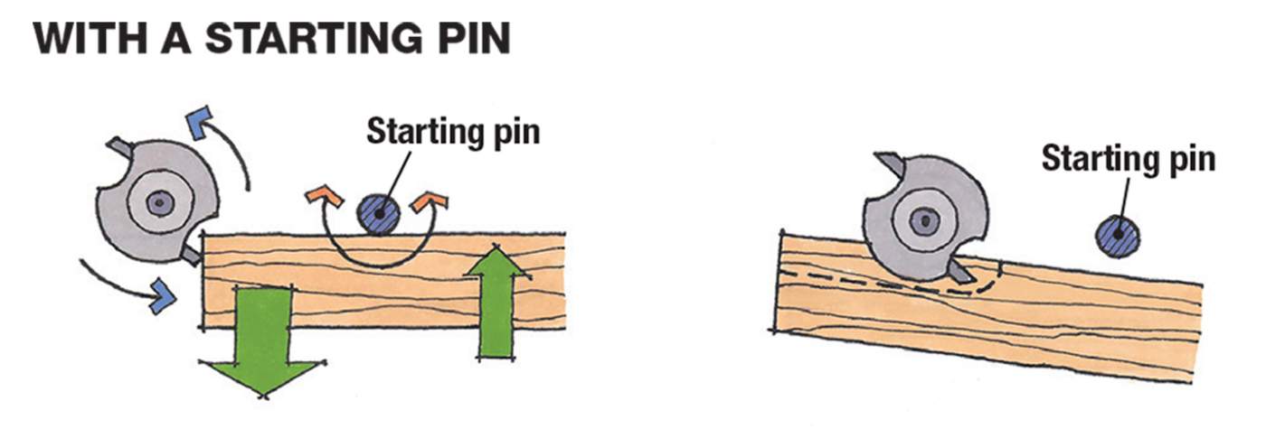 The starting pin gives leverage to counter the rotational force of the bit’s bearing. Maintaining contact with the starting pin isn’t necessary once the work contacts the pilot bearing.