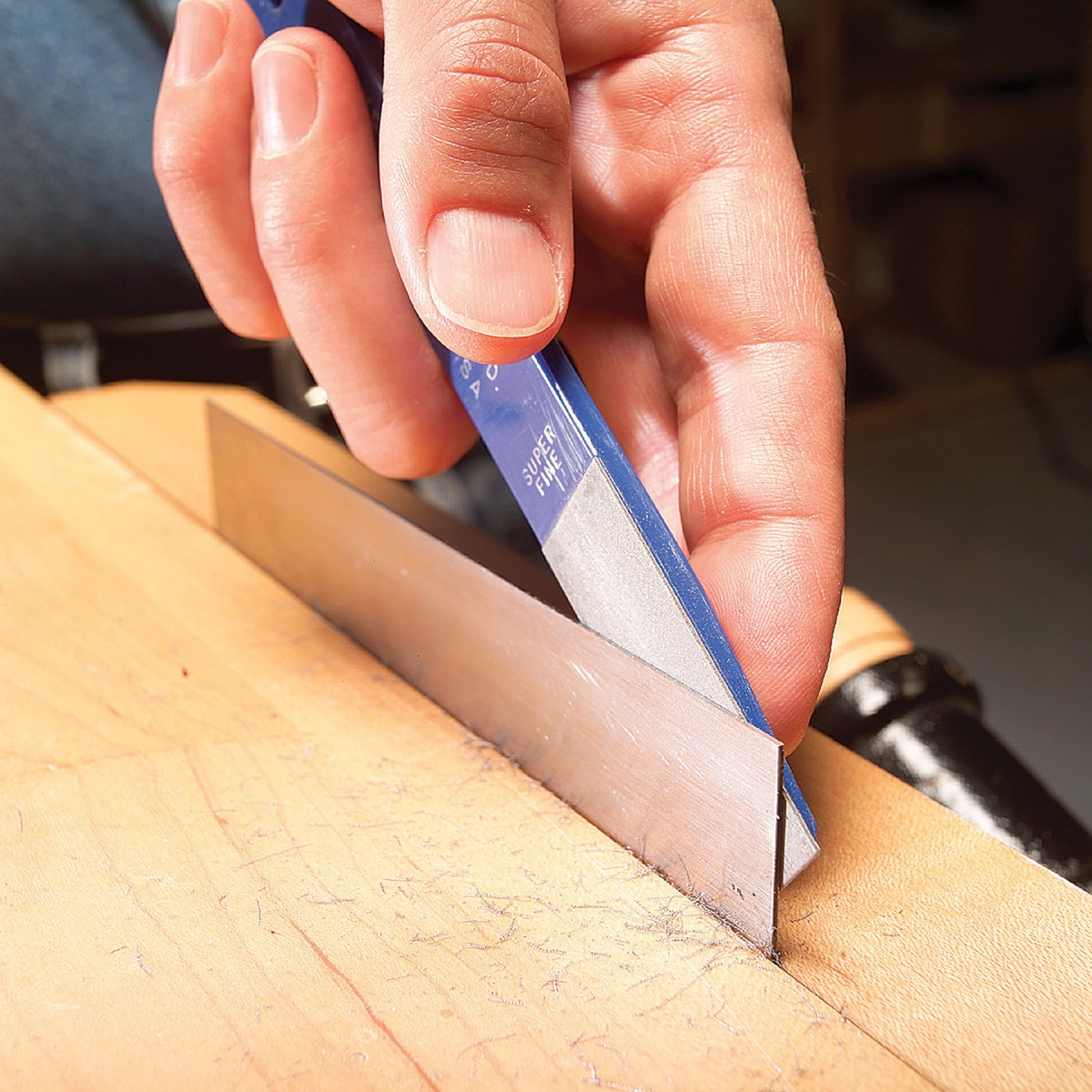 A lot of folks use a stone to put the final edge on a scraper before turning its hook, but I prefer to use a diamond paddle. It cuts faster than most stones and obviously won’t develop a rut, which is always a danger when you continually run the edge of a scraper on a stone.
