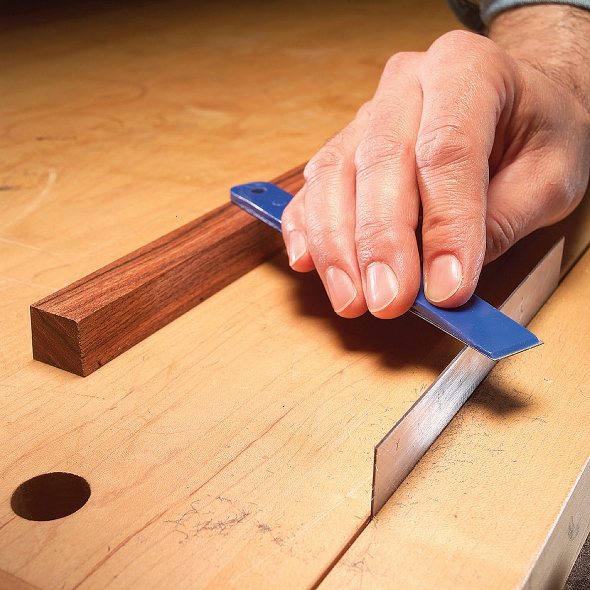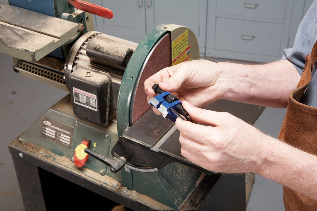 Flatten its face. For accurate and repeatable projection measurements, the two front faces of the jig must be square and even with each other. The easiest way to flatten the faces is by placing the jig on a disc sander’s worktable and gently pushing it into the disc (Photo 1).