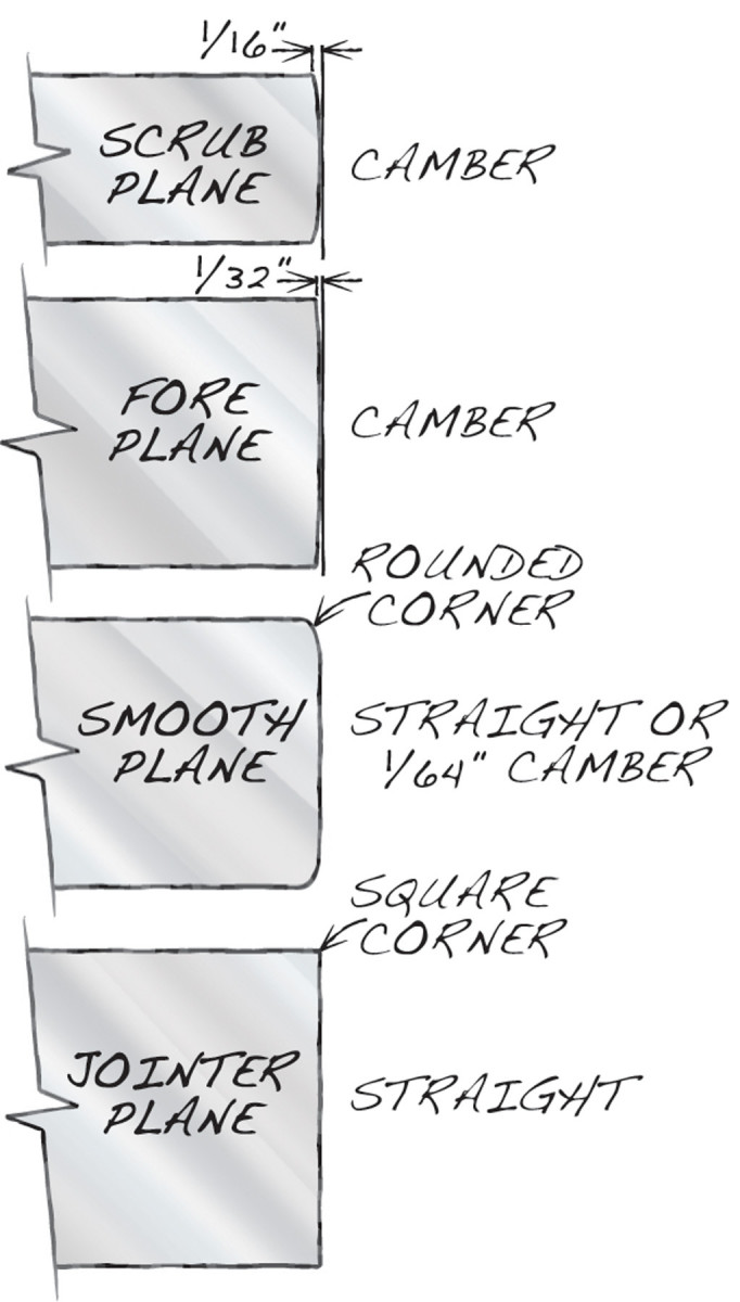 Scrub plane. This tool is used to hog off lots of wood, fast. Its blade has a large camber, which is created on a grinder. (No honing is necessary.) The amount of camber depends on the wood’s hardness and whether it’s green or dry. A 1/16″ curve will take off shavings up to 1/16″ thick, just right for kiln-dried hardwoods.