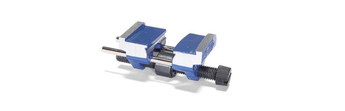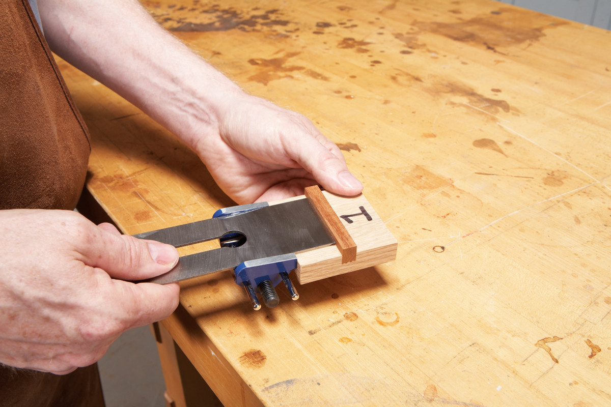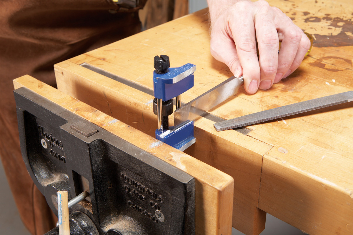 Widen the chisel slots. Many chisels don’t fit very well in the V-shaped grooves because their sides are too thick. Clamp the jig in a vise and use the edge of a 6″ or 8″ mill bastard file to widen the grooves enough to fit your tools (Photo 2).