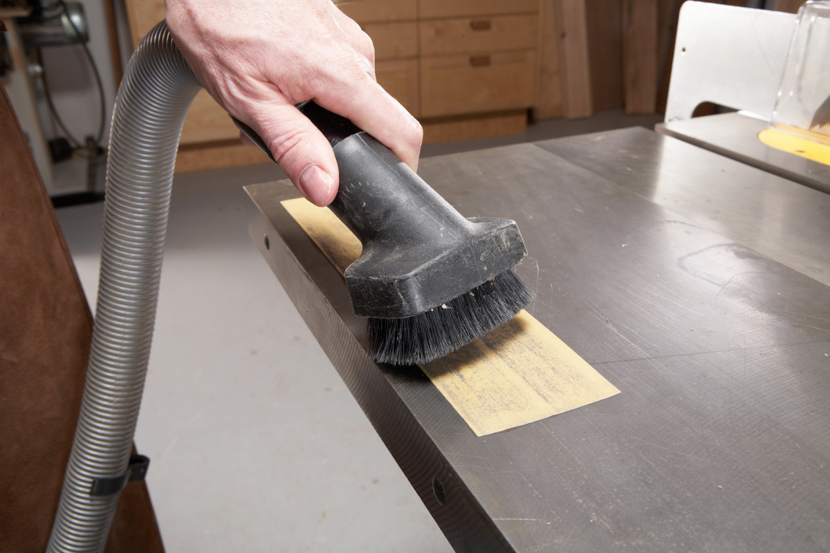 The best way to keep your sandpaper clean when lapping is to vacuum it. Sandpaper is much less efficient when it clogs up with swarf (a machinist’s term for metal debris). Removing the swarf every few strokes makes a tedious chore go faster. Cleaning the sandpaper with a stiff brush or an eraser works so-so, but a vacuum removes everything, almost instantly, with no mess.
