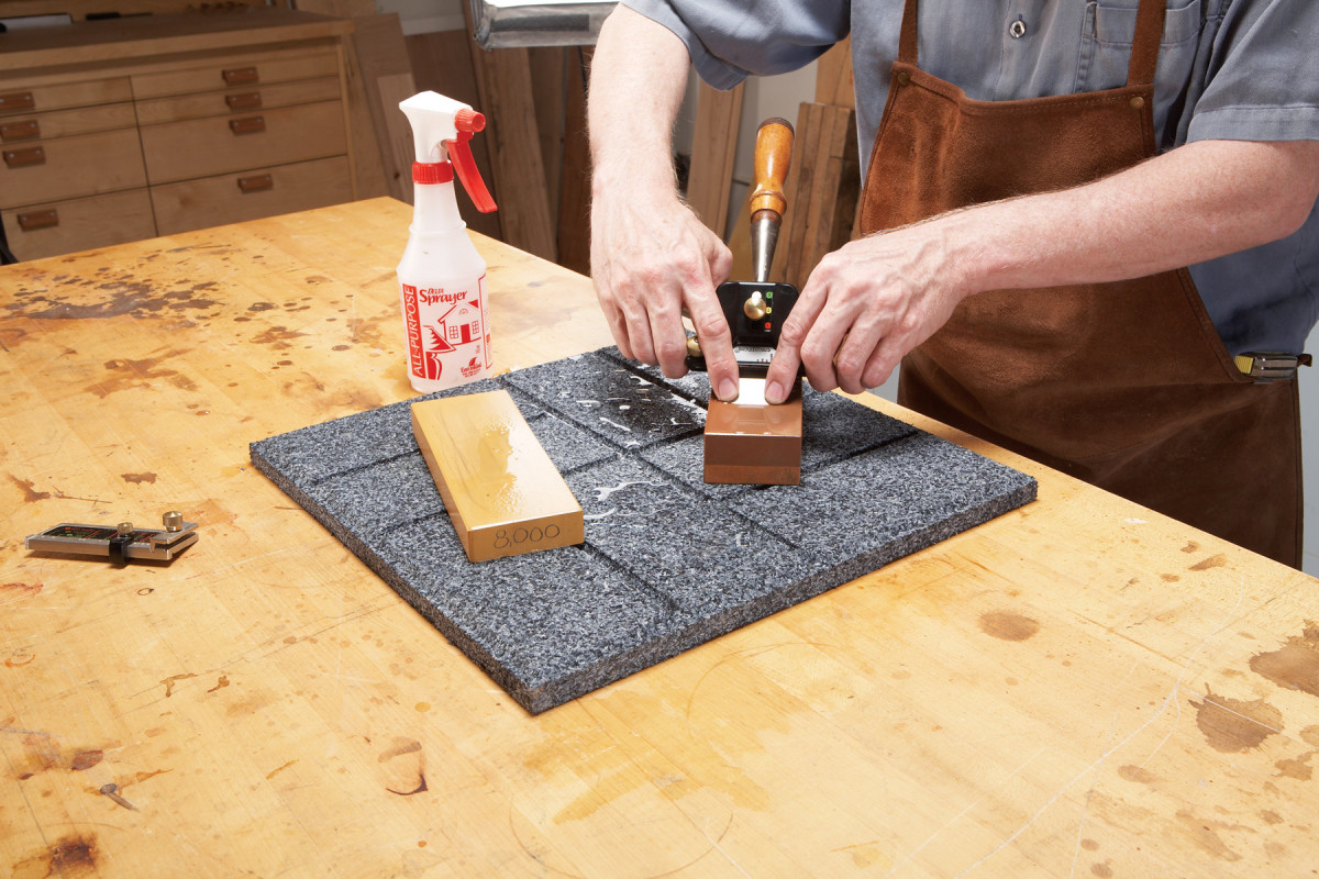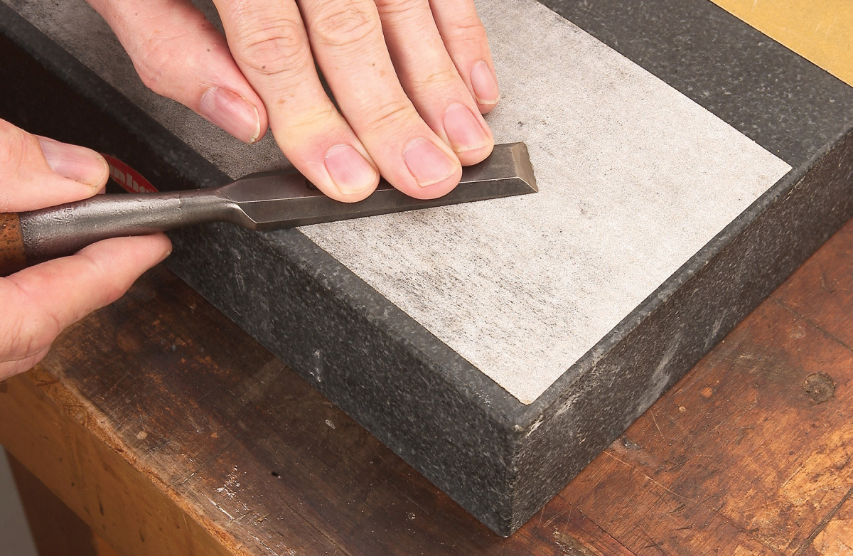 Lapping consists of two stages: flattening and polishing. First, you flatten the back by rubbing it hard on sandpaper that’s adhered to a flat surface. I’ve used a 1/4″ thick piece of glass, the cast iron wing of a tablesaw, or the bed of a jointer, but my favorite lapping surface is an inexpensive granite surface plate (see Source, below).