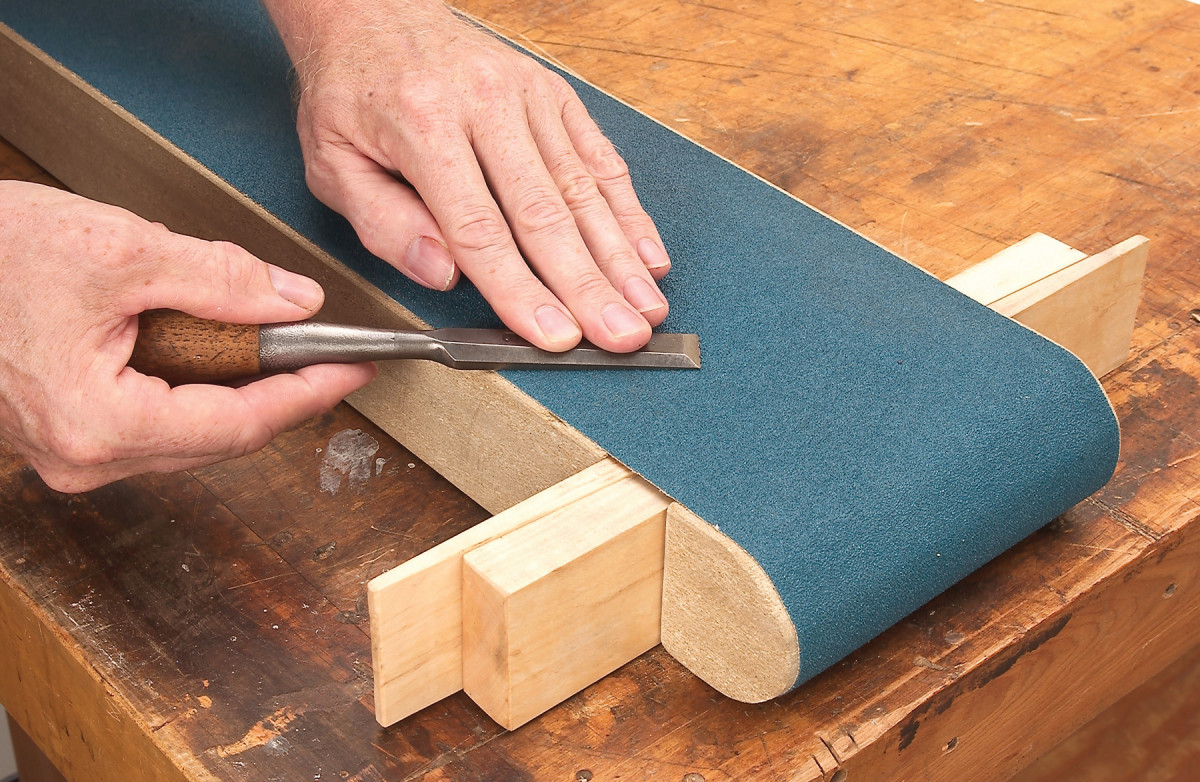 You can chew up a lot of sandpaper flattening a plane iron, a large chisel or the bottom of a plane. It makes sense to use paper that lasts a long time–like a sanding belt. But, if you cut a belt to lay open, it won’t sit flat, because its backing is too stiff.