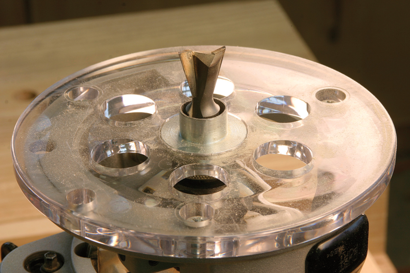 To eliminate the handle problem, I turned to a guide bushing. Again using plywood, I fashioned a jig for circle cutting. This time, instead of affixing the jig to the router base, I positioned a ¾”-diameter hole where the router bit would be located. The hole, which could be sized to match any size guide bushing, allows the bushing that’s installed in the router to spin freely as a circle is cut. The ability to spin during use means my hands stay in contact with the router throughout the cut.