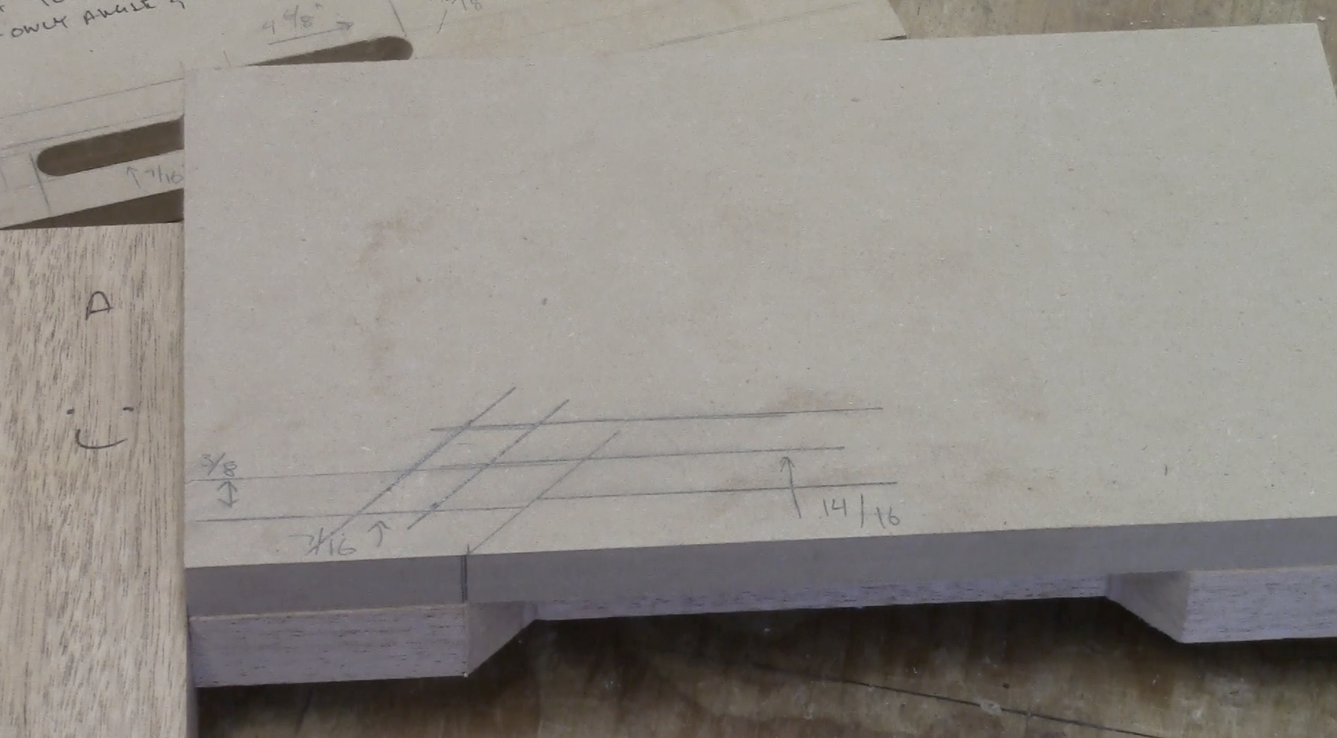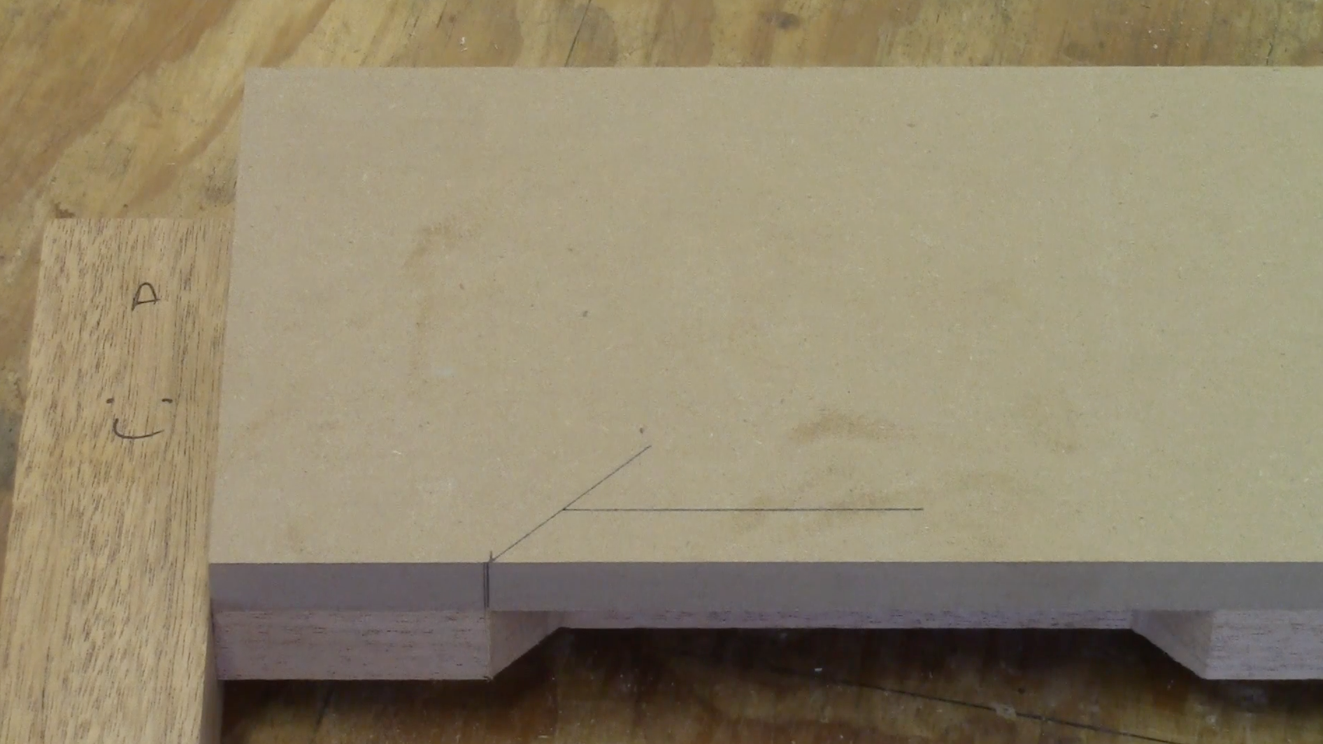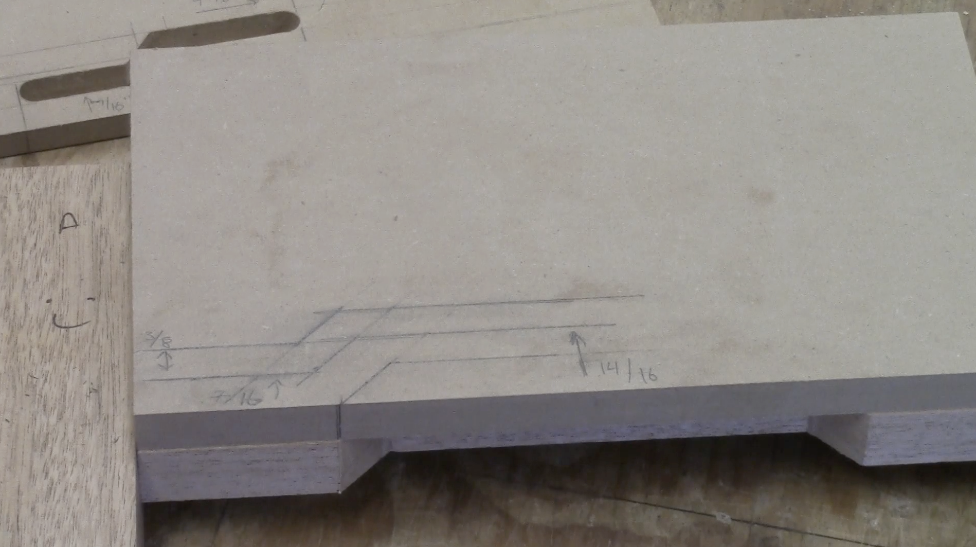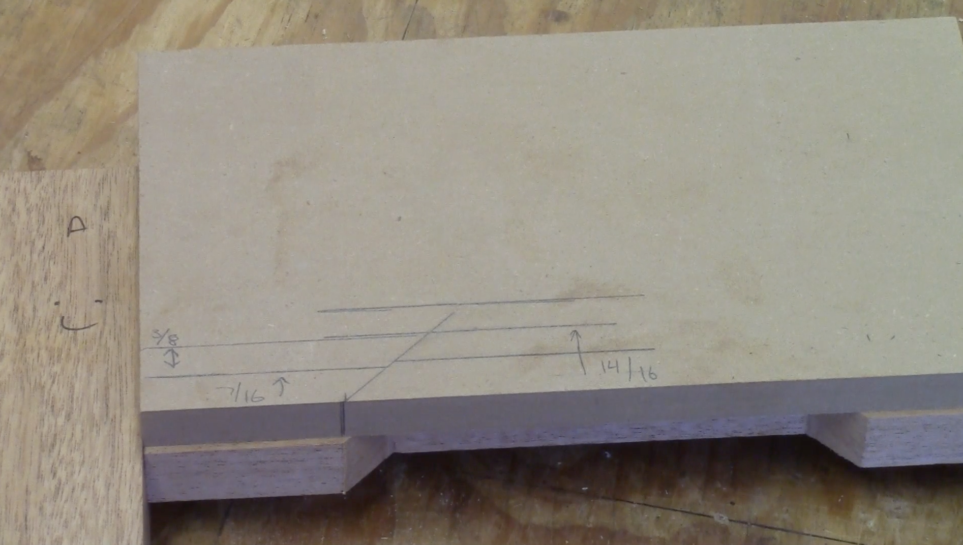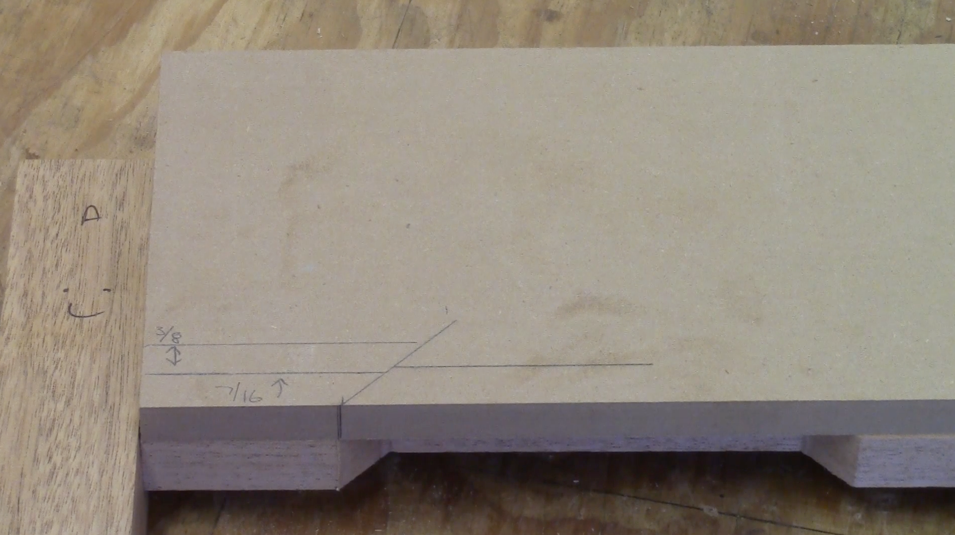 4. Align a ruler to the 45 degree angle line, make ticks marks ½” up and another 3/8” above that and connect them with your square and intersect them with your lower lines set at 45 degrees