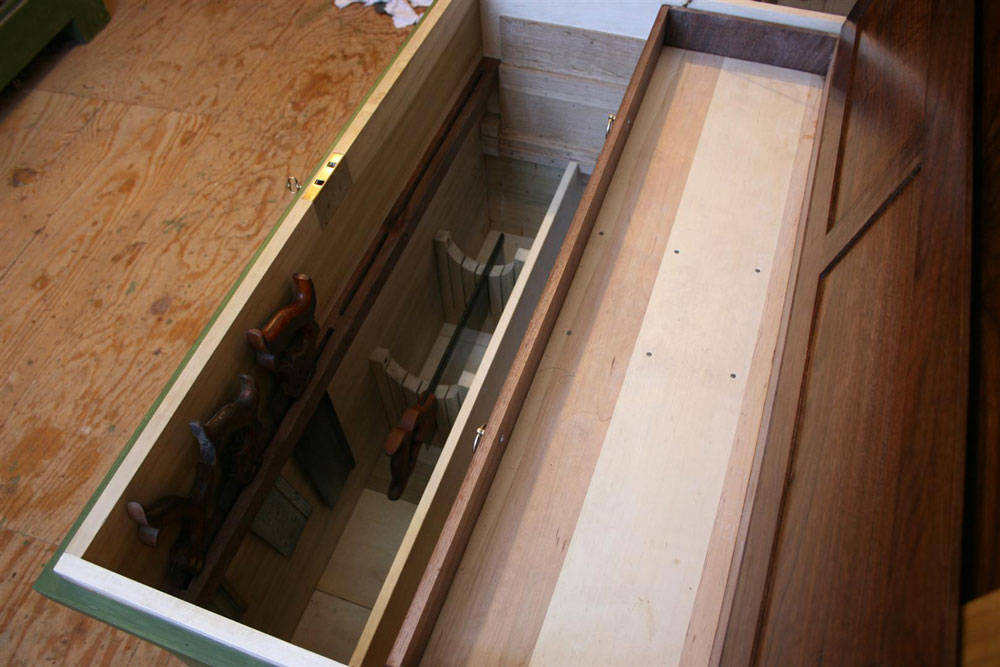 And.. The saw rack is deeper than the bottom till: remove the walnut ‘floor’ visible in other photos to reveal the deep cavity. Note brass finger-pull to lift out the floor.