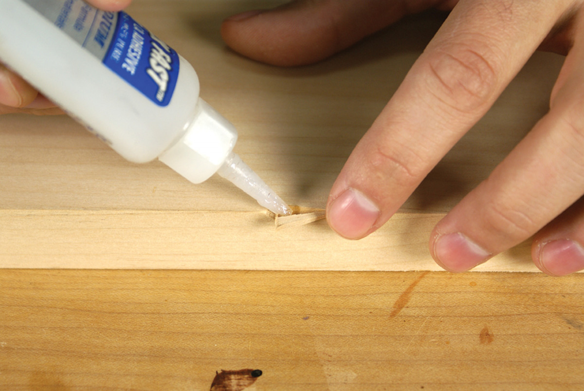 There are two glues that I turn to whenever I have to repair knots, digs, scratches or tear-out: cyanoacrylate (CA) glue and epoxy. CA glue, also known as Super Glue, is a fast-drying brittle glue that does a fine job of filling small holes and cracks as well as reattaching small pieces of wood that may have torn out. And if you have a little bubble in your veneer, CA glue is great for that, too. Just use a syringe to inject some glue under the veneer and clamp it down for a few minutes.