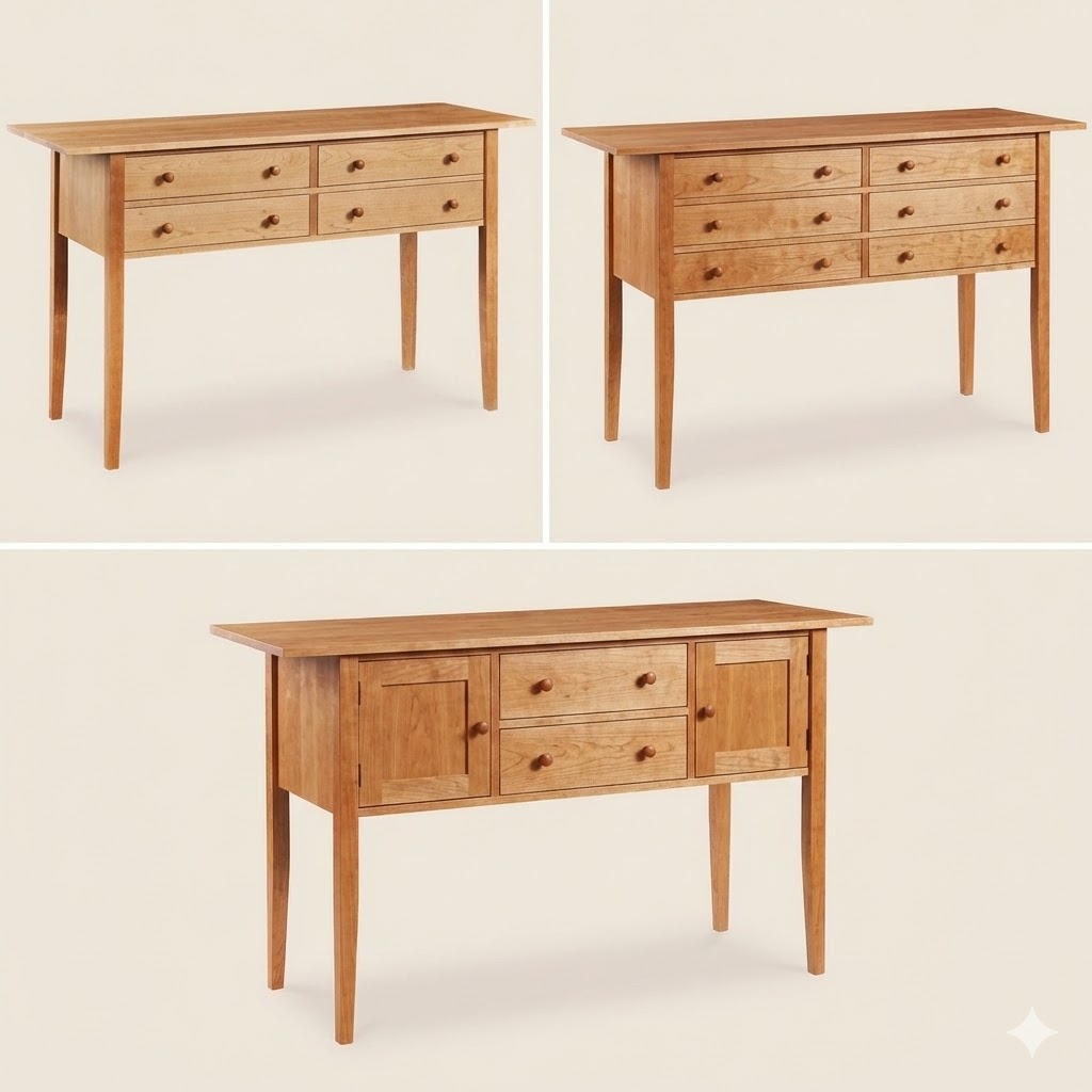 Here you can see the three options side-by-side: the original four-drawer Shaker sideboard (top left), a version with a third row of drawers added (top right), and a variation with two central drawers and two doors (bottom).