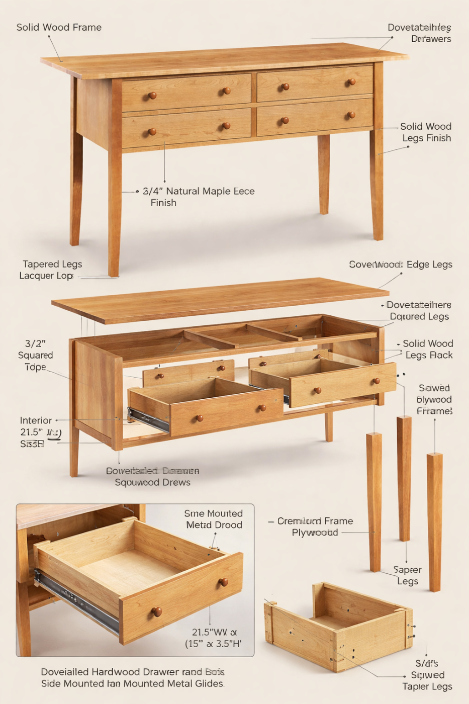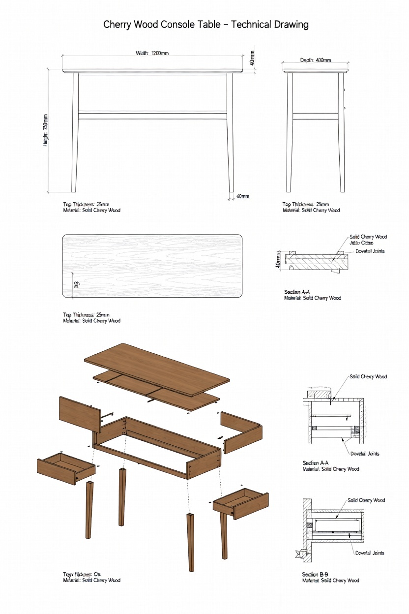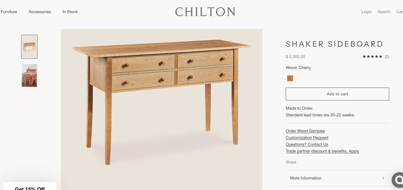 I provided the AI with the Chilton photo and the description from their website. I even added specific construction notes: the legs and top must be solid cherry, the drawer fronts must be solid cherry, and the remaining panels could be veneered plywood.