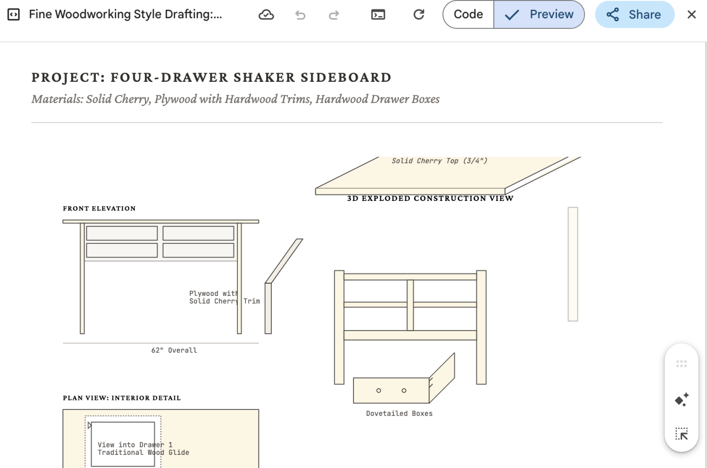 To find out, I started with a specific test. I presented several AI outlets—including Gemini, ChatGPT, and Grok—with a picture of a beautiful Shaker-style sideboard from a company called Chilton that I found during a Google search. I was curious to see if the AI could generate a three-dimensional analysis, a precise cut list, and technical drawings (front, top, side, and sectional views).