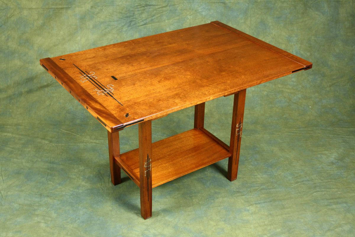I’d like to show you how to make this kind of inlay using a design found on a set of three tables the Greenes created for the Freeman A. Ford house in Pasadena. In this pattern, flowing organic “vines” of silver wire are balanced by linear ebony strips and surrounded by silver dots. When I built one of these tables, I discovered that these designs—using just two materials—are a good entry-level introduction to the world of Arts & Crafts inlay. I’ll be showing you how to make the inlay on one of the table’s legs.