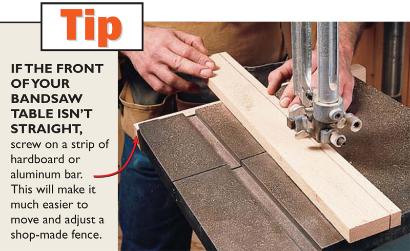 An auxiliary table helps and is a must for cutting logs. Resawing also requires a fence. Some bandsaw manufacturers have fences available for their saws ($75 to $100), or you can make one. The fence should be high enough to support the material you’re cutting and adjustable to compensate for blade drift.