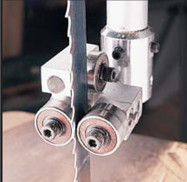 9. Guide bearings instead of guide blocks (shown here without the guard) can help bandsaw blades run straighter. They cost about $150, and are available for virtually any saw (see Sources).