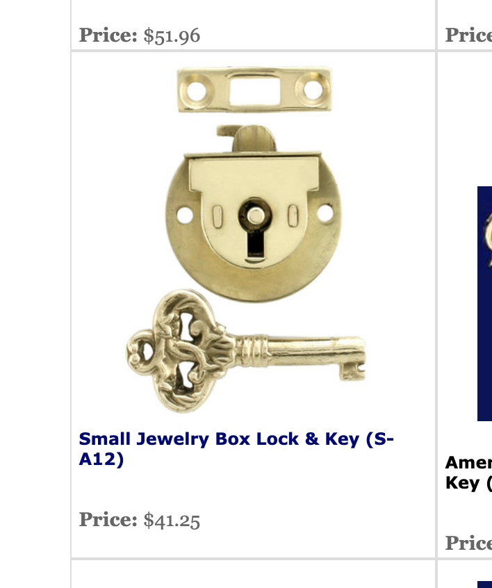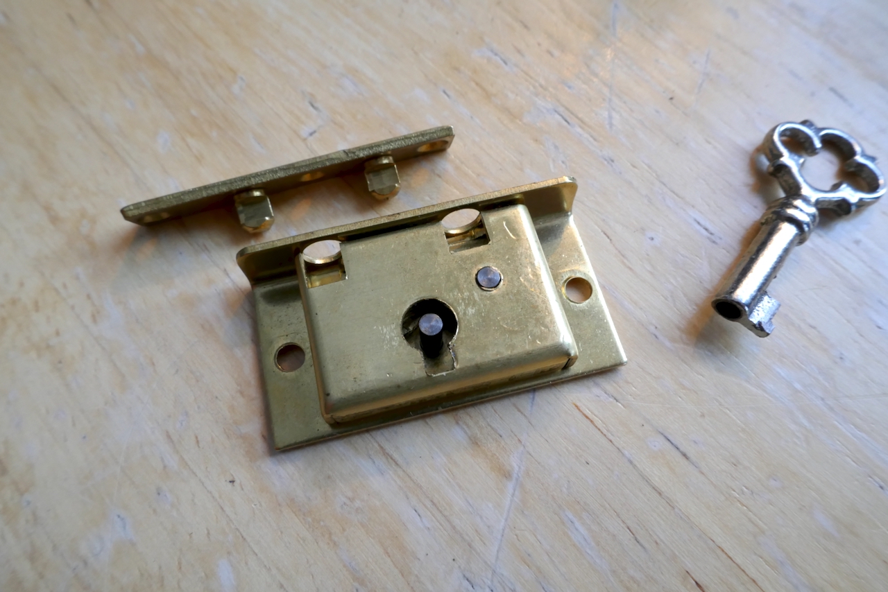 This beautiful English-made box lock, designed for a small jewelry box, is sold by Horton Brasses. At around $50, it isn’t cheap, but the quality of the casting and the smoothness of the bolt action are world-class.