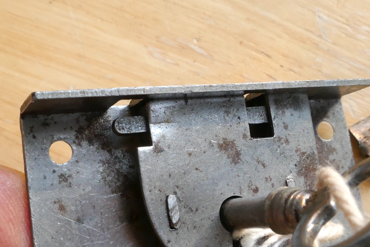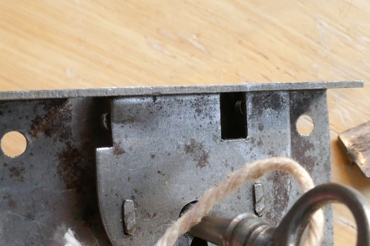 Instead of a tongue, the boss plate features one or two protruding elements known as bosses. These bosses are either grooved or have a central hole. When you close the lid, these bosses drop down into the body of the lock. When the key is turned, a vertical bolt (or latch) slides into the hole or groove of the boss, preventing the lid from being pried open.