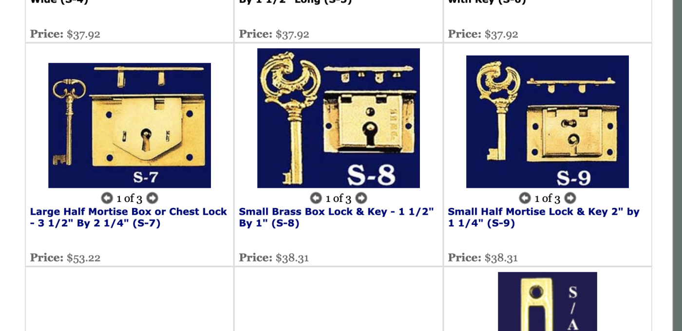 Sreenshots from the Vintage Hardware and Lighting store showing the variety of specialized locks they carry. These are prime examples of the kind of niche supplier you need to have in your bookmarks.