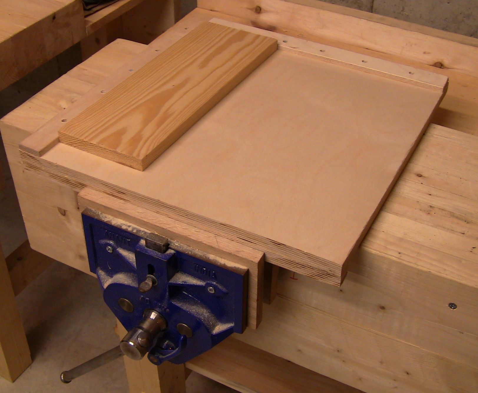 Construction is simple: a base of 3/4” plywood, two 1 1/4” wide by 3/8” thick stop strips (3/8″ plywood or resawn solid lumber) glued and screwed to the top, and a 1” by 3/4” stop strip glued and screwed to the bottom. Countersink the screws to avoid hitting them with a plane during use.