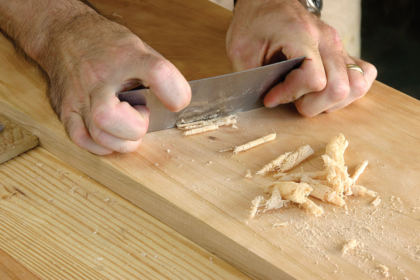But most power-tool woodworkers go a step further. They scrape and hand sand to remove the scratches left by random-orbit sanders and pad sanders – the so-called pigtails you see on so many furniture-store pieces. In the power-tool world, these hand tools are the “fine” tools.
