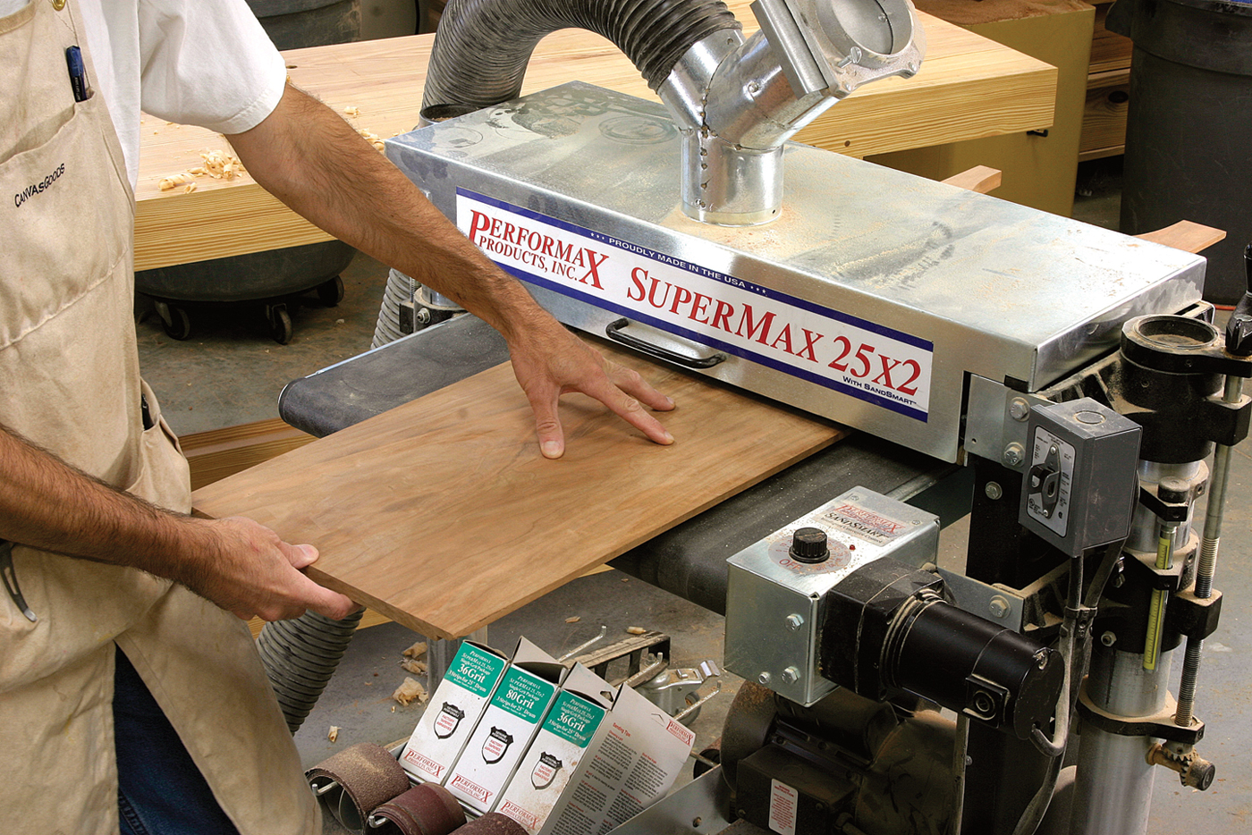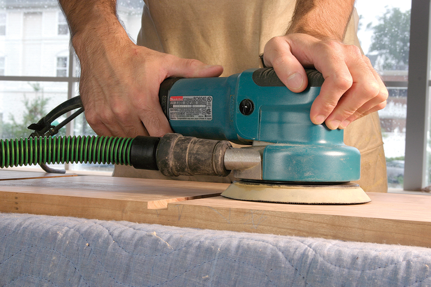 A drum sander (above) can level and true a panel much like a jointer plane. A random-orbit sander (below) is ideal for removing machining marks in a power-tool workshop.
