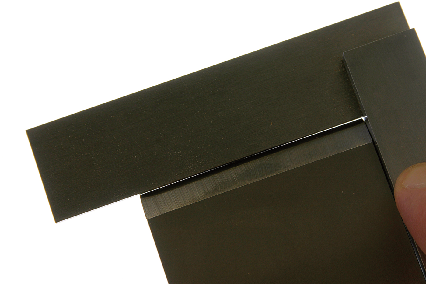 A silhouette of the shape of my jointer plane’s cambered iron. I placed a feeler gauge on the end to see how far back the corners were swept: it’s .005″.