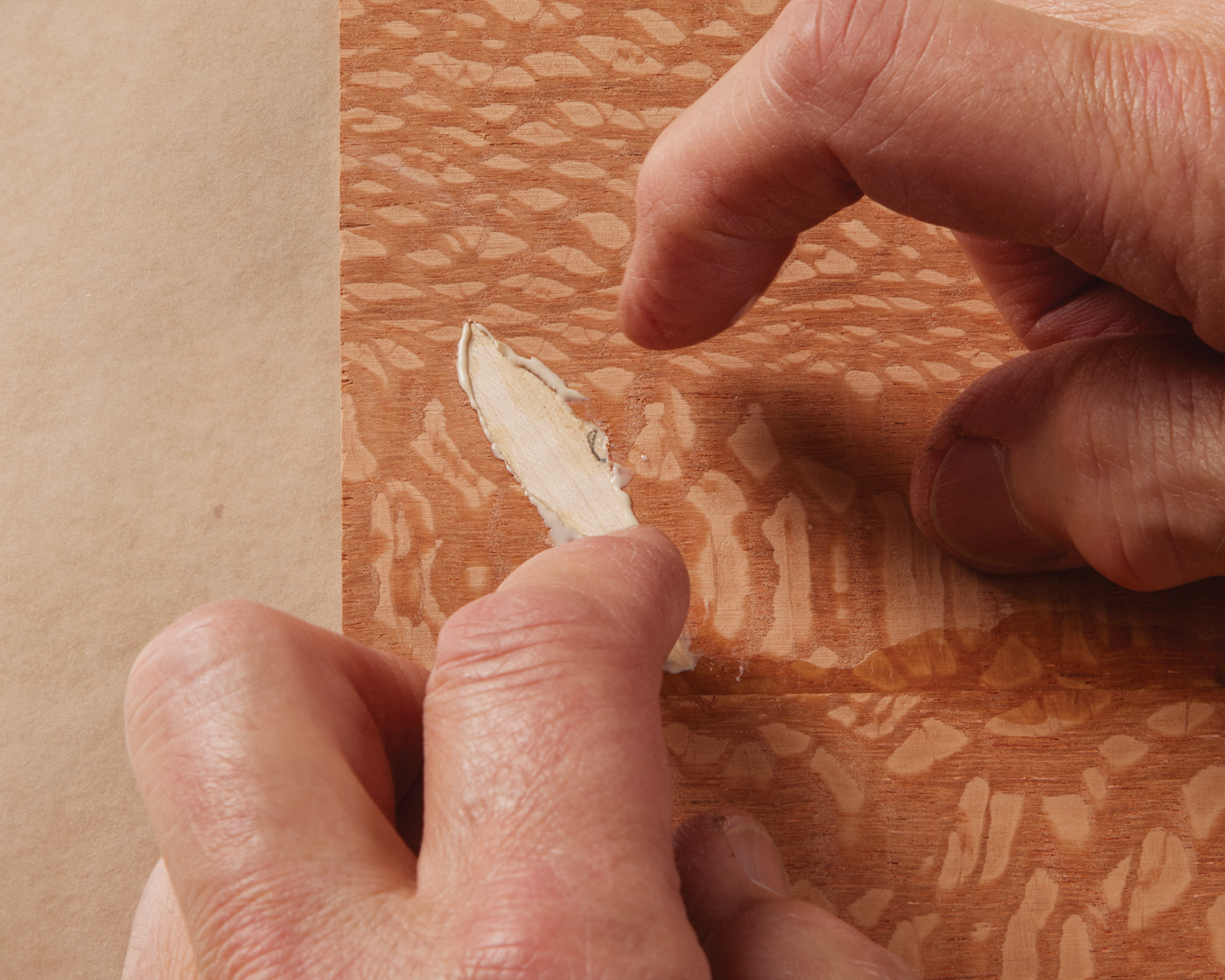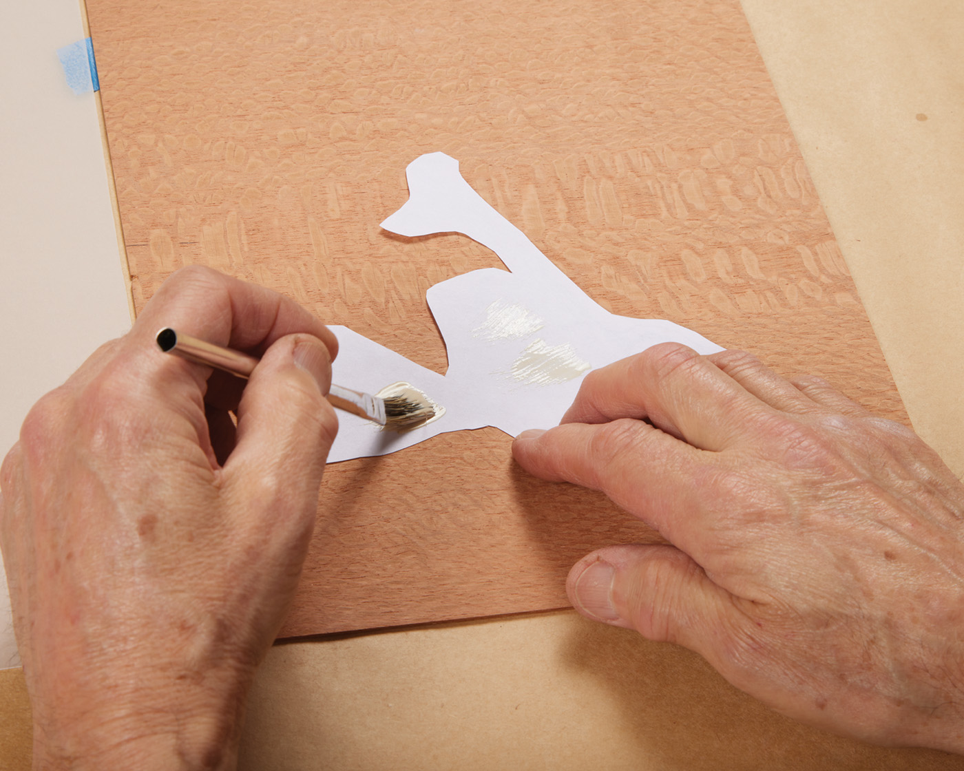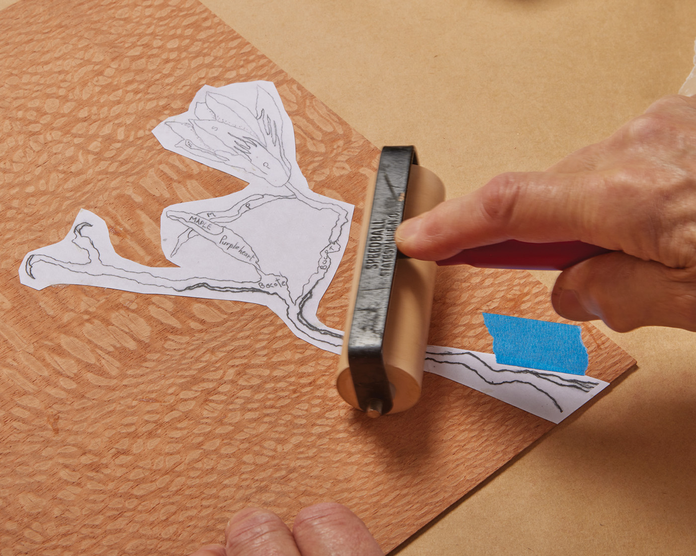 Carefully place the insert veneer underneath so that it aligns within the drawing area and secure it with masking tape. Use as many pieces as you need—they’ll act as temporary clamps. Burnish the tape into the edges with your fingernail to make sure it grips solidly and nothing moves.