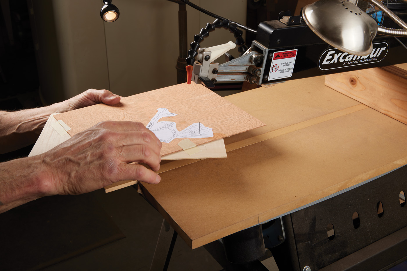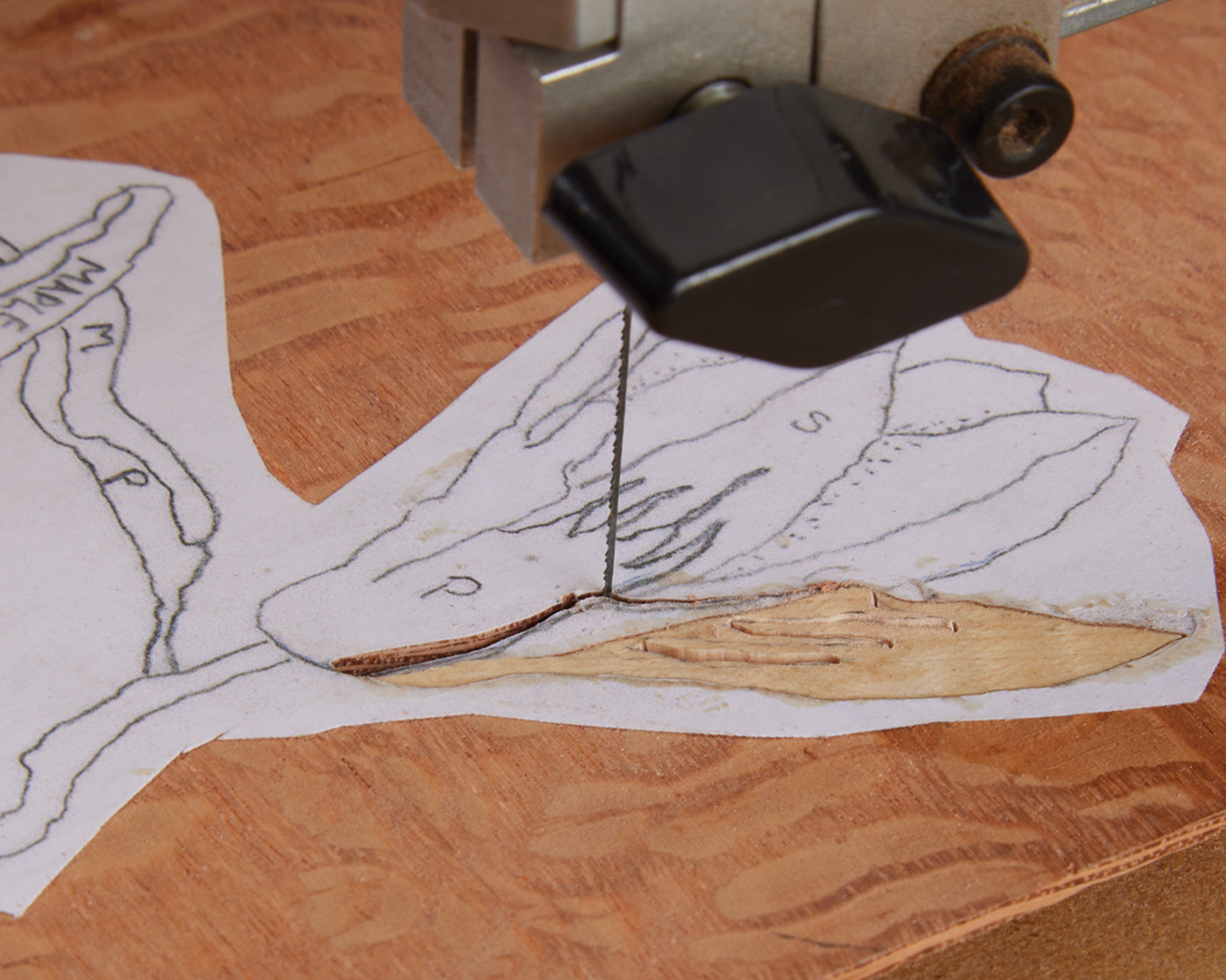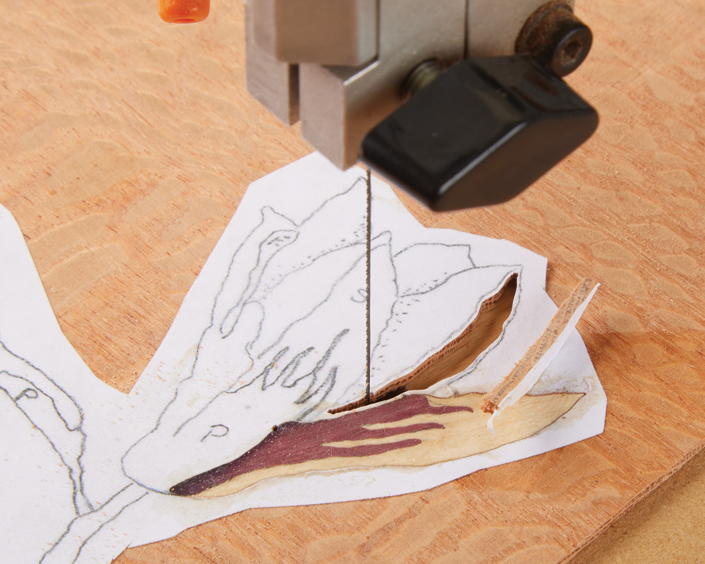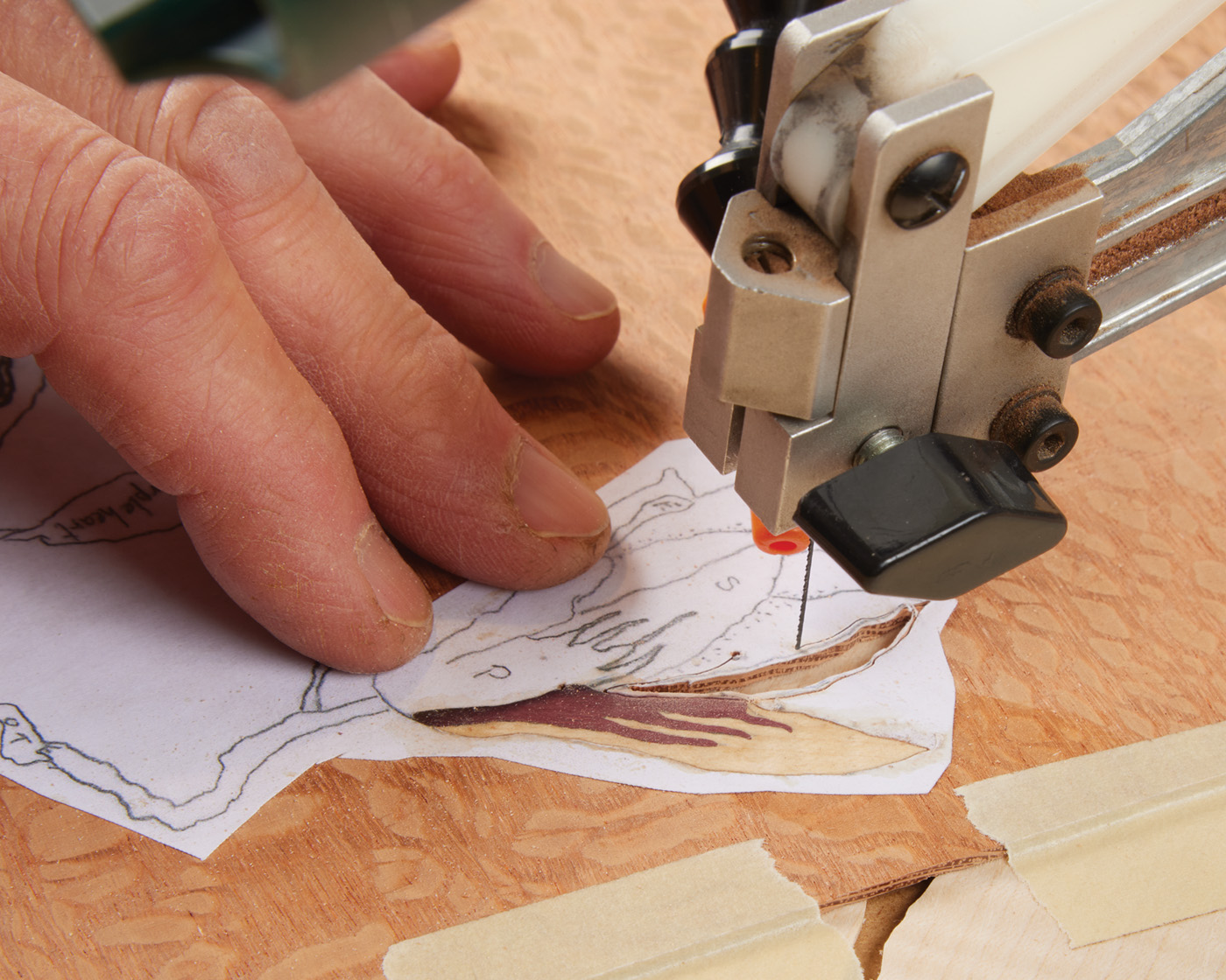 The technique is fairly straightforward. It consists of a background veneer onto which the design is drawn, and an insert veneer that is held in place underneath with masking tape. When the scroll saw is tilted down to the left at the appropriate angle (6° is what I use for 1/16“ thick veneers), the blade cuts through both pieces simultaneously. The kerf of the blade is then filled by the wedge-shaped insert underneath. The end result is a perfect fit with no gaps—which is why I love this method.