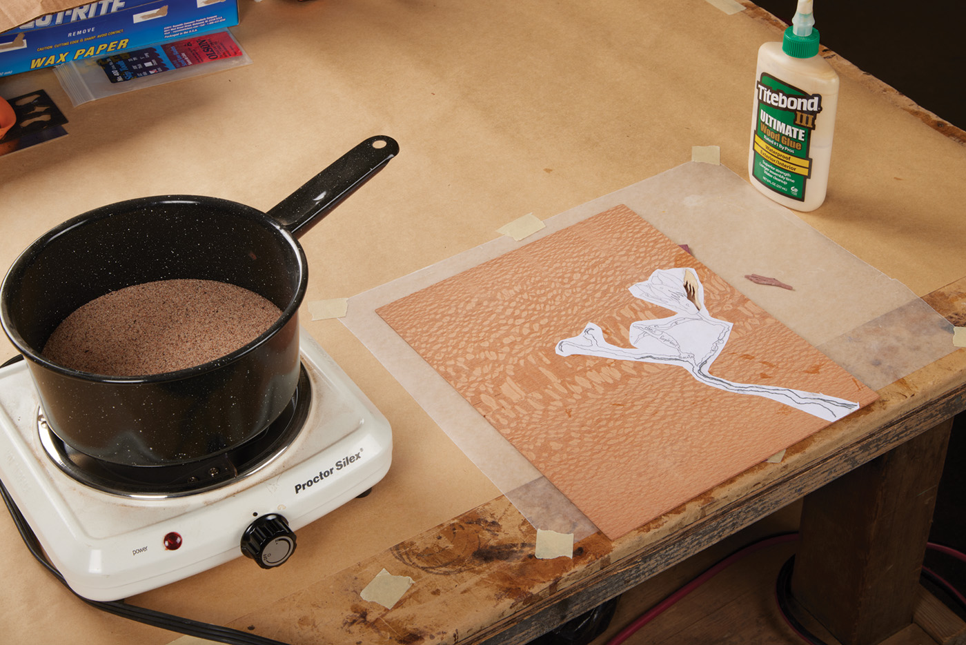 Sand shading is another important technique in marquetry because it creates shadows and adds three-dimensionality. Kiln-dried fine sand works best. I’ve purchased 30-mesh sandbox sand, though you could use something finer.