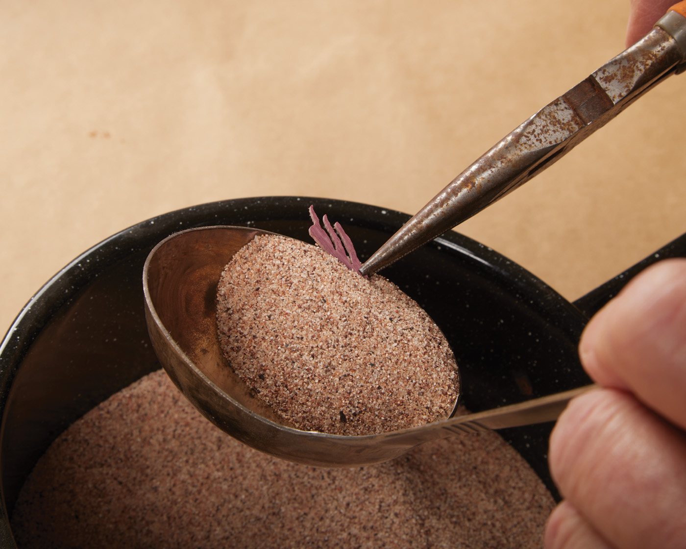 I imagine a light source, then decide where shadows fall based on direction. I use a pencil to mark areas I plan to burn later. Using a ladle to scoop the hot sand and pliers or tweezers to hold small pieces is helpful.