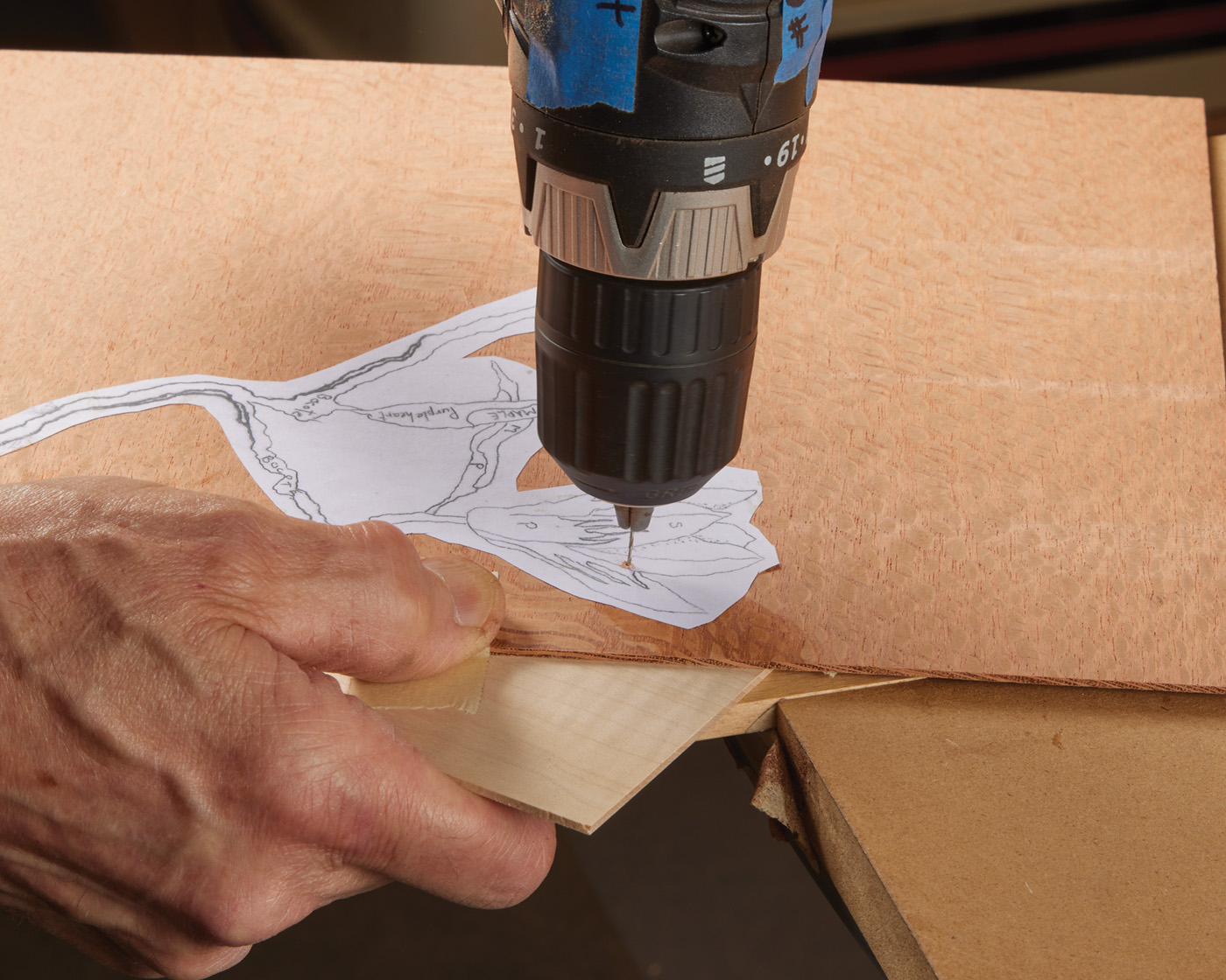 6 After taping the base veneer and the inlay veneer together, pierce a starting hole, just outside your working area.