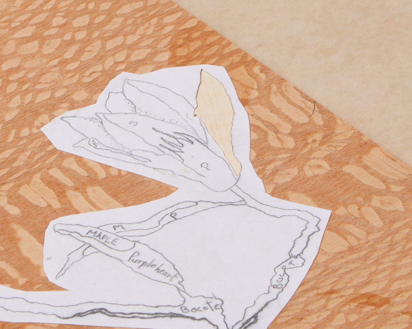 To illustrate: in the following photos you can see that I selected Lacewood (aka Australian Silky Oak) as my background veneer. I cut my own veneers on the bandsaw to net 1/16“ thickness after drum sanding. Next, using photocopies of my drawing, I cut out and glue the image onto the background veneer. I always do test cuts on scrap veneer to confirm my numbers, and I keep coming back to 6° for my 1/16“ thick veneers. That number creates a nice snug fit with just enough room for glue.
